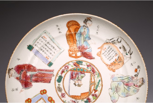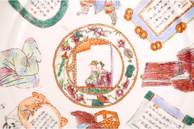 The interior finely painted with four prominent historical figures with associated name and praise next to it, the center further painted with a couple in a pavilion, the underside base inscribed with apocryphal reign mark. Qing Dynasty period.