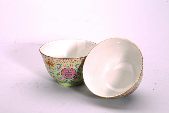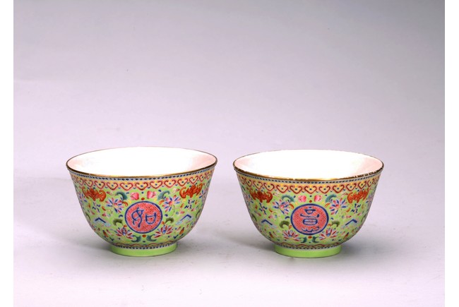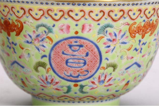 Chinese. Each bowl is painted around the body with four medallions characters 'Jixiang Ruyi' in auspicious meaning, between auspicious bats suspending chime and lotus, all reserved on turquoise green ground, the base inscribed with six character Jiaqing mark. Qing Dynasty period.