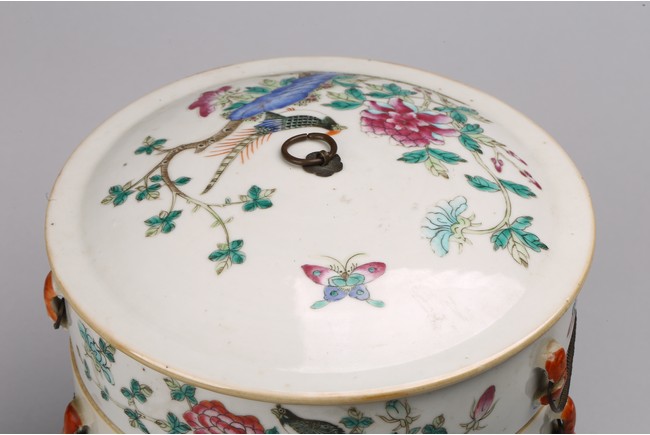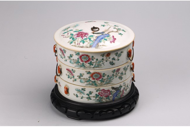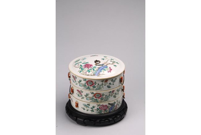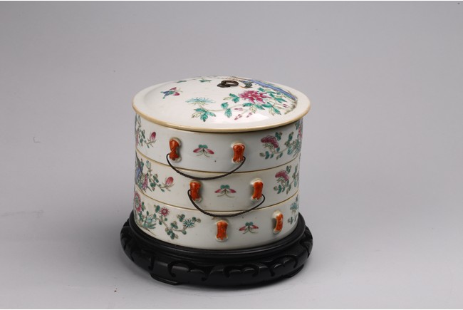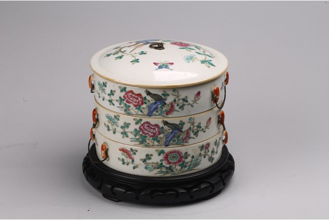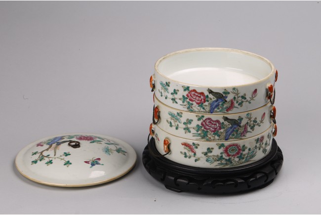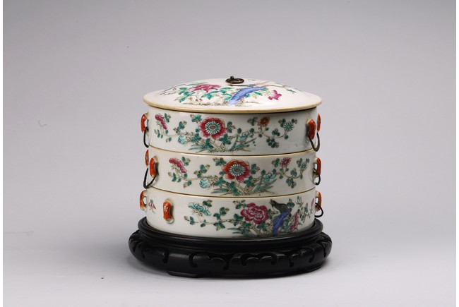 Chinese. Each circular-section tier painted in famille rose with flowers, the domed cover further decorated with birds and flowers. Qing Dynasty period.
