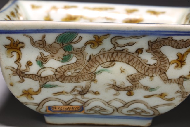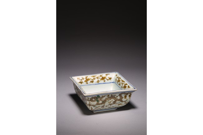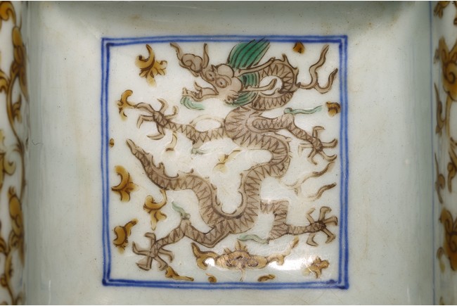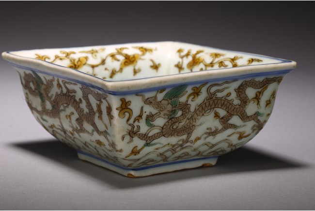 Of square section, the slightly rounded flaring sides rising from a short tapering foot to an everted rim, painted to each side with a phoenix soaring amidst floral sprays, the interior decorated with a dragon within a double square to the centre, the base with a six-character Jiajing mark in underglaze blue. Ming Dynasty Jiajing mark.