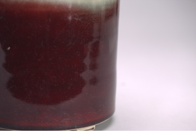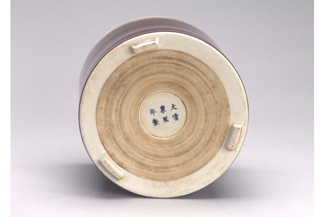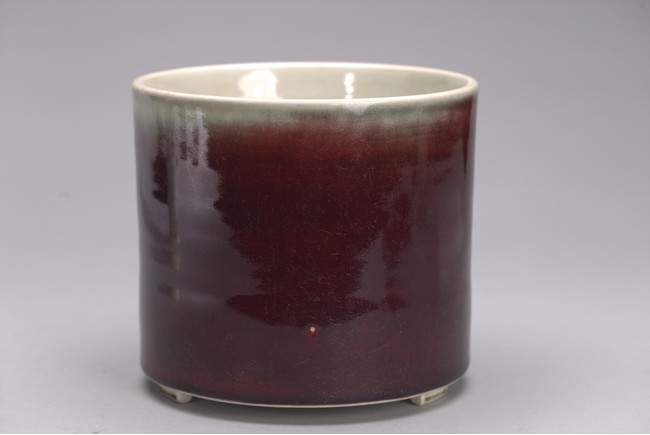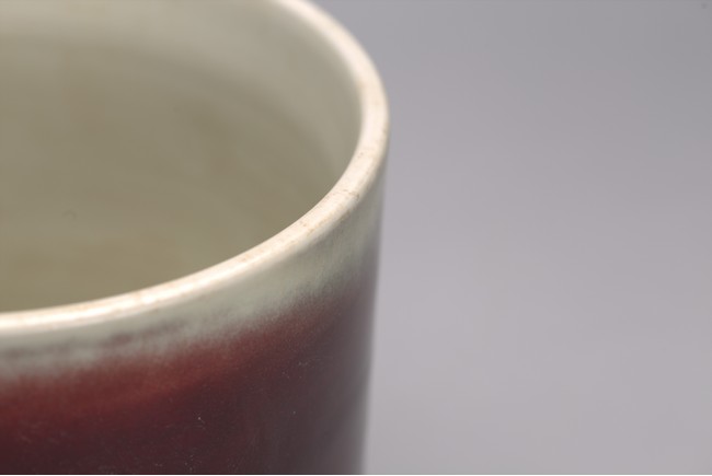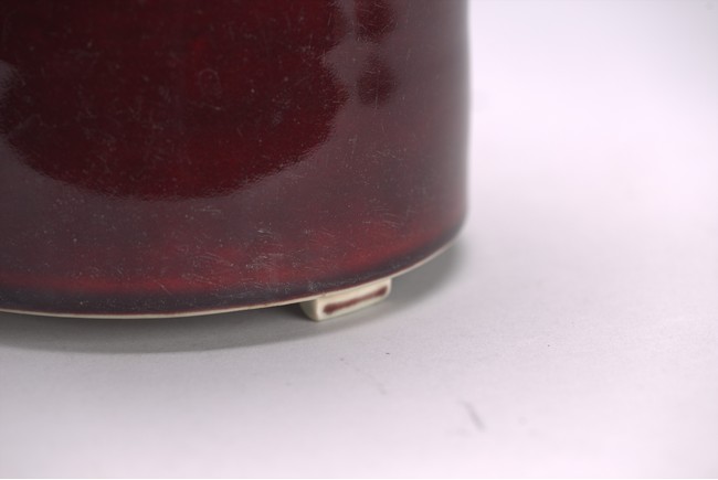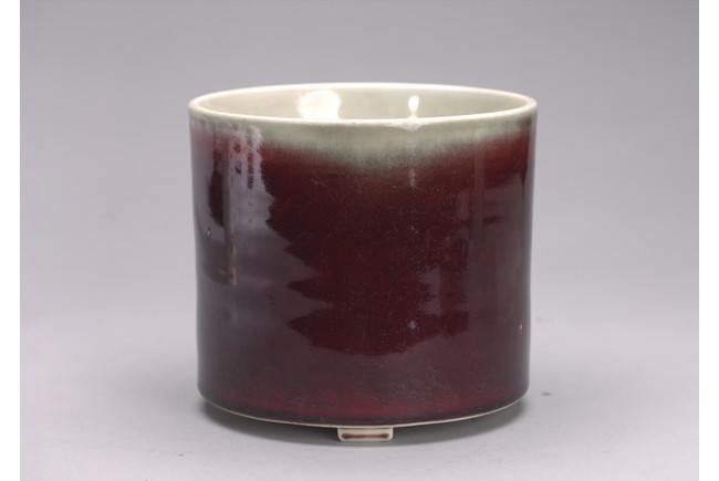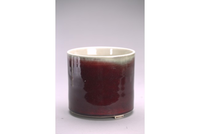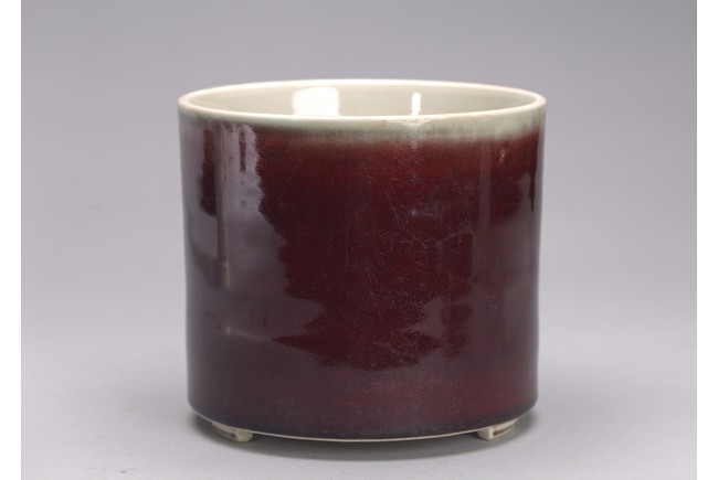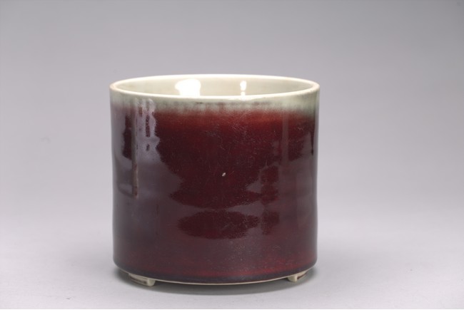 Of cylindrical form, the exterior covered in a raspberry-red glaze stopping neatly at the foot, the interior glazed white, the base unglazed except the rim and center which inscribed with six character kangxi mark.