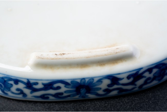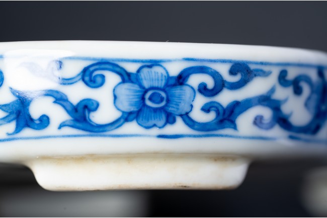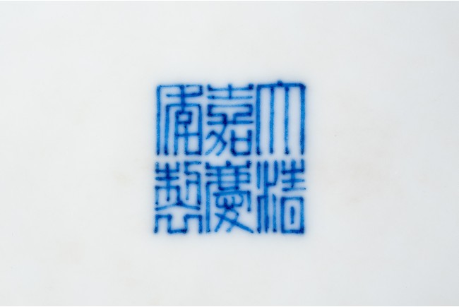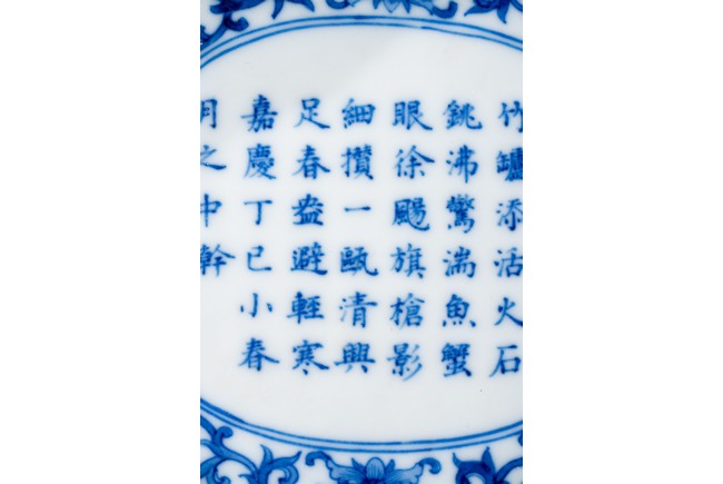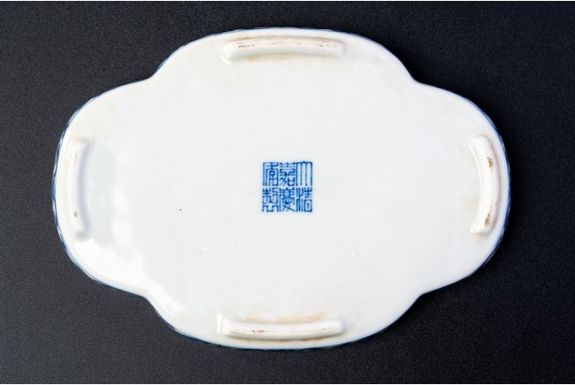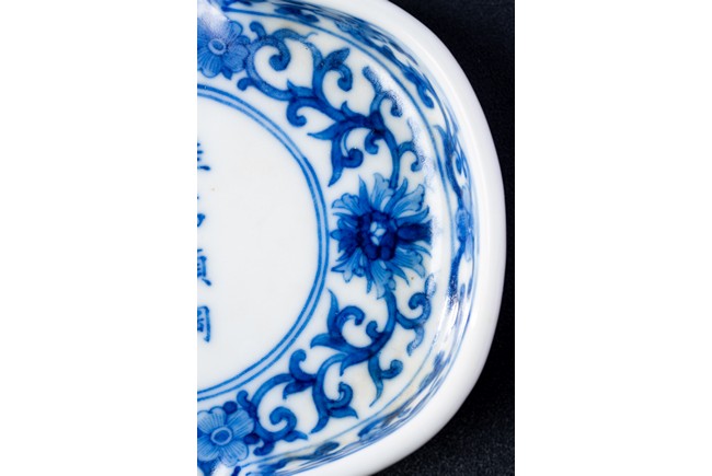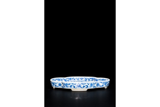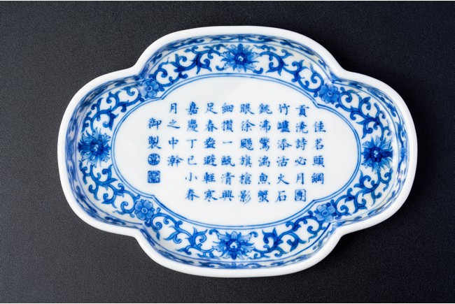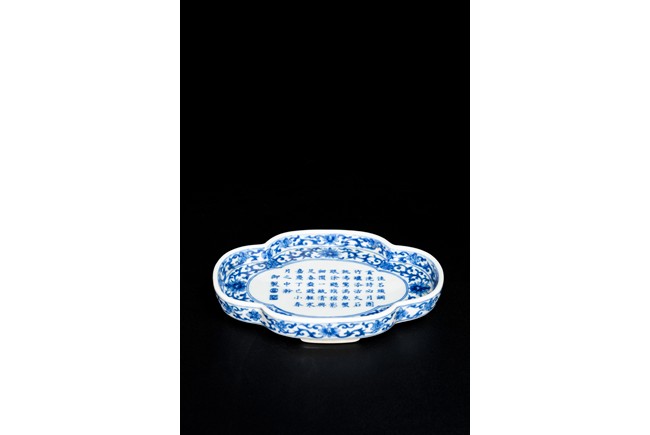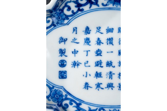 The shallow lobed sides of quatrefoil section, resting on four small incurved feet, decorated to the interior with a quatrefoil panel enclosing an imperial poem, set within a band of scrolling lotus and florets repeated on the interior and the exterior of the walls, the base inscribed with a six-character seal mark.