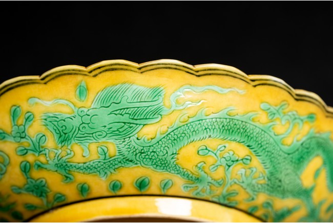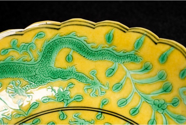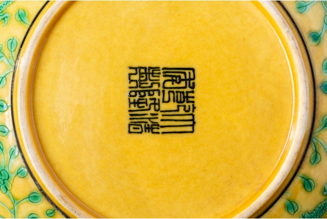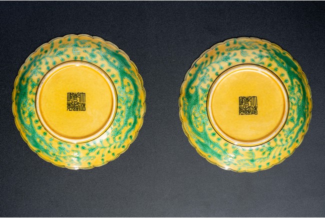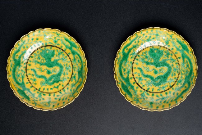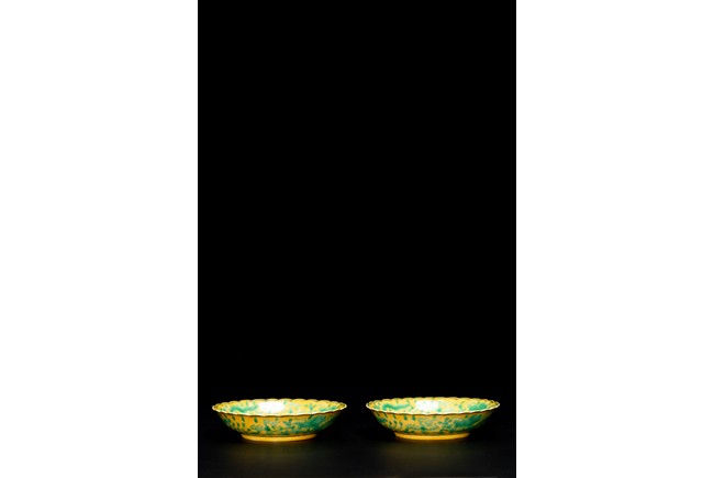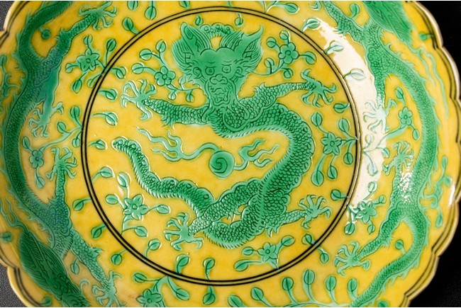Each incised and painted in green enamel against a yellow ground, the interior with dragons striding among clouds in pursuit of flaming pearls, the exterior with floral sprays.