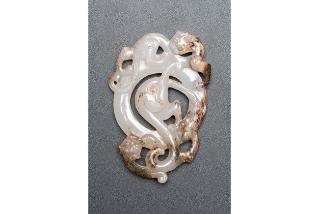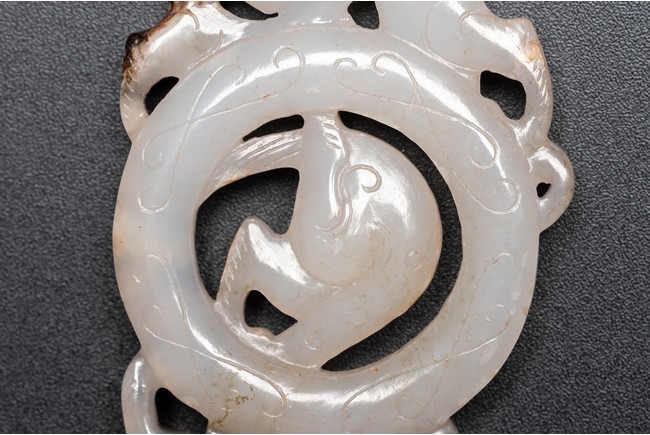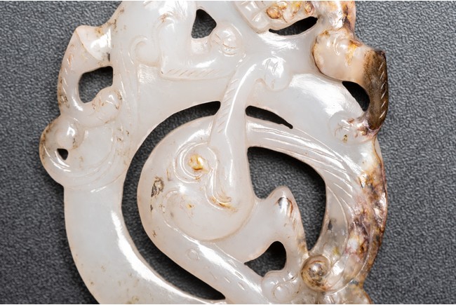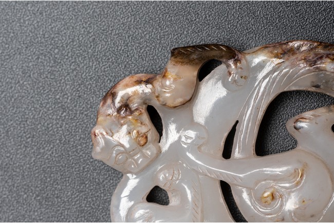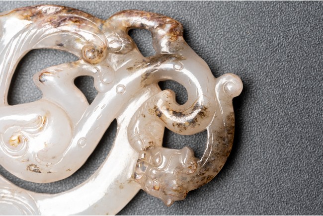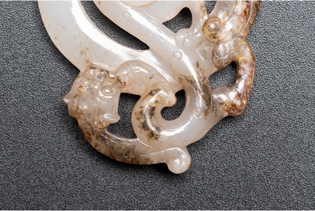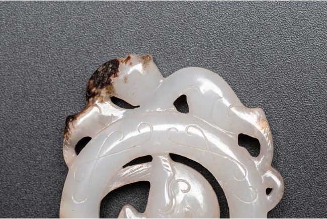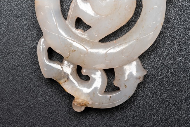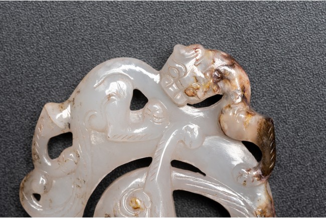 玉質溫潤細膩,瑩潤光潔,局部帶有黑褐色沁色,包漿肥厚。螭龍雙耳貼腦,圓眼,闊嘴,身姿婉轉,線條流暢,自然生動,工藝精湛。