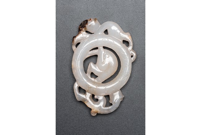 Carved in the form of pair of intertwining chilong, the stone is of polished white tone with russet areas. Qing Dynasty period.