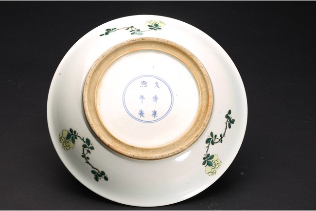 敞口弧腹,平底圈足,以紅、黃、黑、深綠、淺綠、碧綠、翠藍、茄紫八色繪人物,繪畫工致精麗,生動傳神,色彩瑰麗多姿、濃艷奪目,人物刻畫傳神細緻。整體造型委婉有剛性,做工精緻富有力度,線條挺立,色階豐富,立體感強。 “大清康熙”年制。