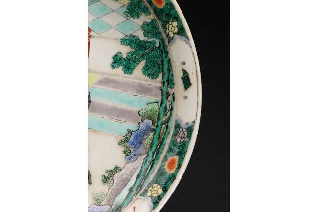 Qing Dynasty period. With curving sides, the dish painted to the interior with four figures, including two elegant ladies, a monk, and a scholar literati within background of pavillion garden, next to wutong and rockworks, the green trellis-pattern border reserved with auspicious object motifs, the base bearing six character Kangxi mark.