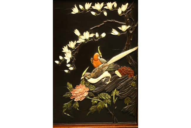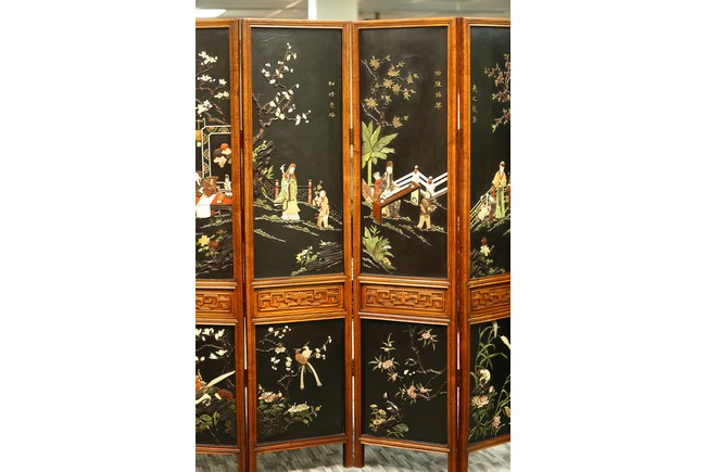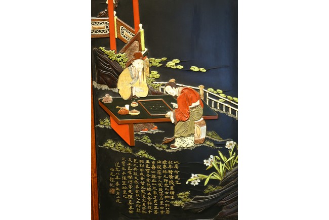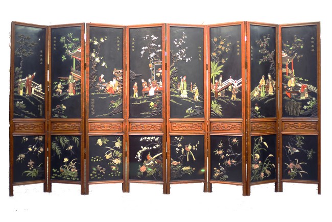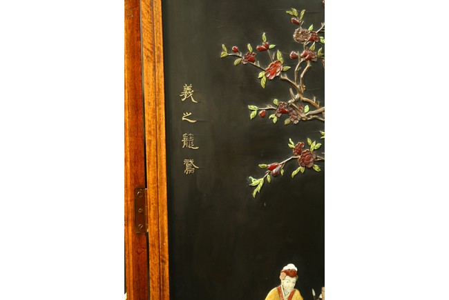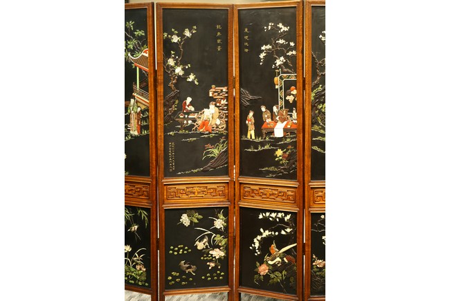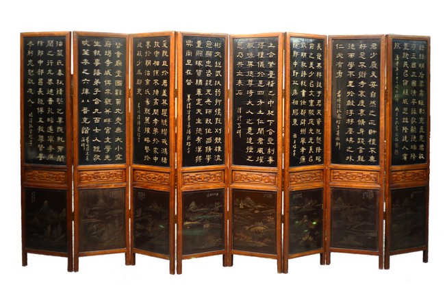 Qing Dynasty Daoguang period. The center section of each panel inlaid in jade, agate, soapstone, quartz, aventurine, mother-of-pearl, cinnabar lacquer to depict eight story scenes including scholar toasting to the moon, scholar appreciating the chrysanthemum, scholar studying the inkstones, two immortals playing chess, etc, with inscription dating to seventeenth year of Daoguang reign (1837), each with lower panel depicting various birds and flowers, in between a hardwood panel with carved archaistic pattern; the reverse painted with calligraphy inscriptions in clerical script.