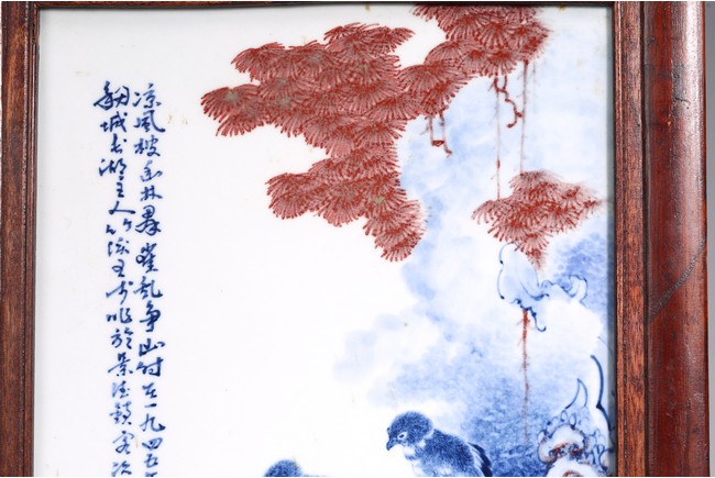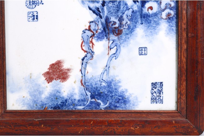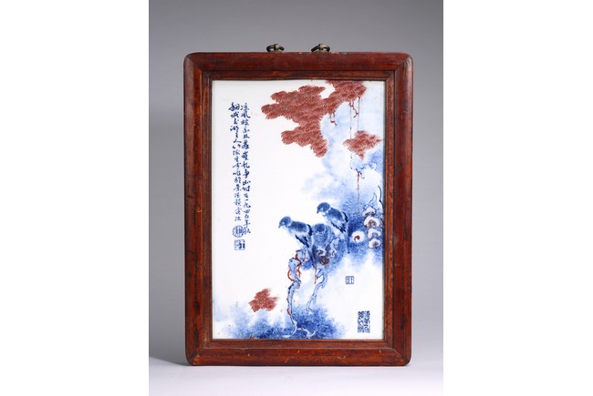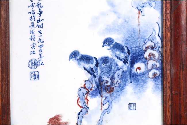 Of vertical rectangular form, finely painted in blue and white and underglaze red to depict three birds perching on tree branch, with inscriptions and signed Wang Bu to the left with four painted seal marks, all within hardwood frame. Republic period.