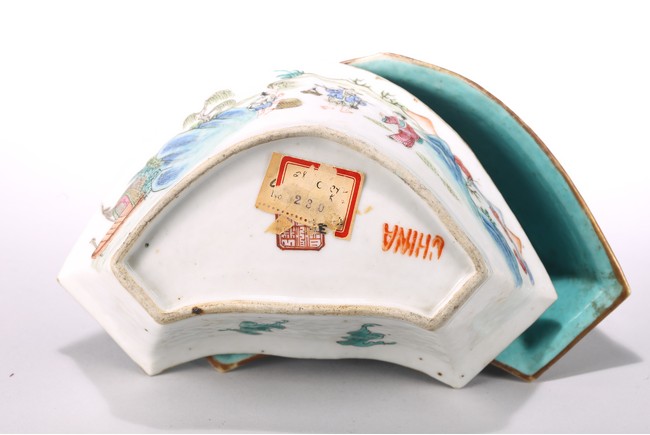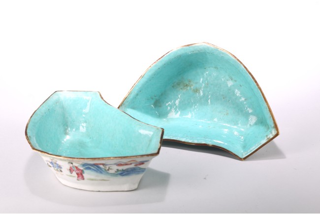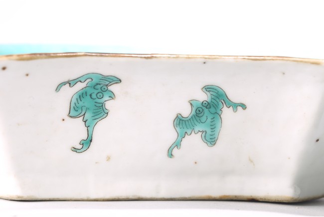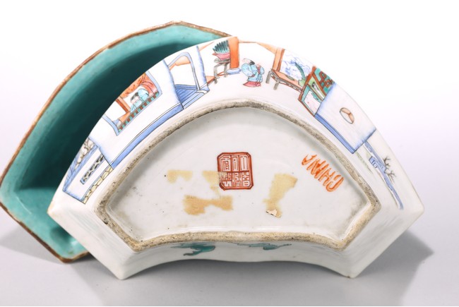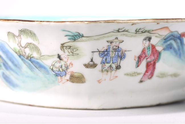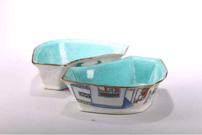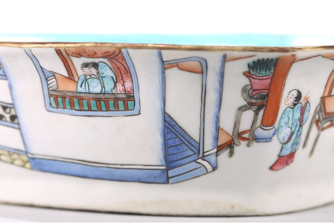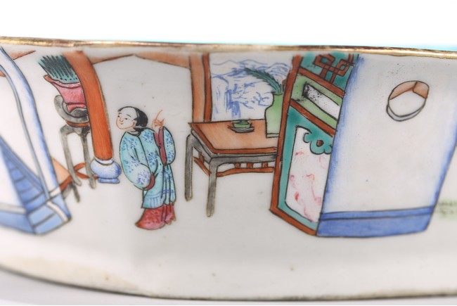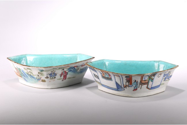 Each decorated to the exterior with figures in palace terrace and in outdoor garden, interior glazed in turquoise green, the base inscribed with Tongzhi period mark. Tongzhi period, 19th century, Qing Dynasty.