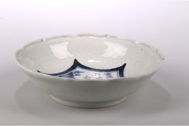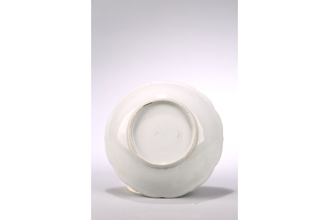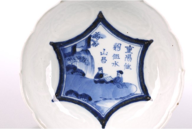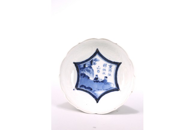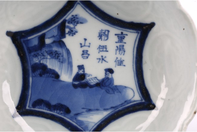 The interior of the lobed rim dish decorated with two figures playing chess on river bank, below an inscription. Qing Dynasty period.