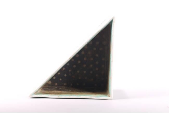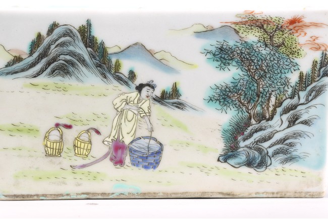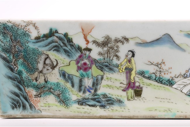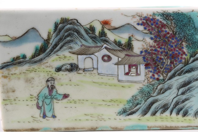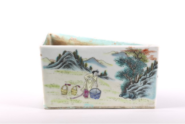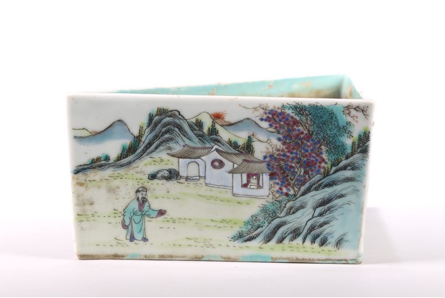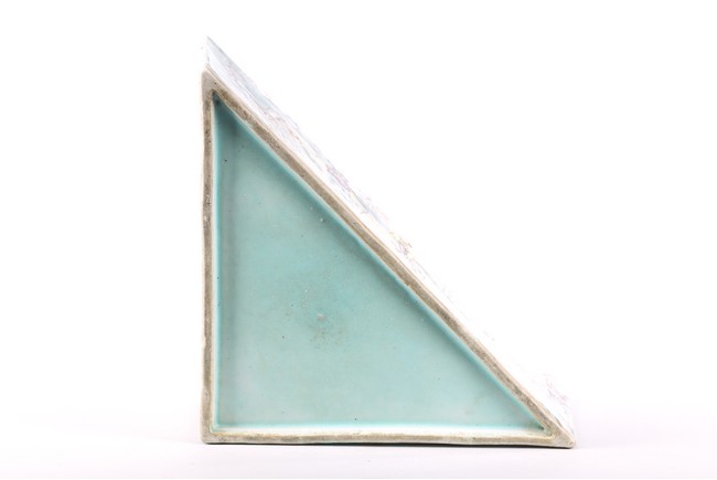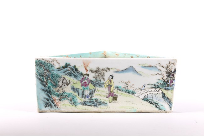 The triangle shaped bowl decorated with figures and landscape around the exterior, the base and interior covered in turquoise green. Qing Dynasty period.