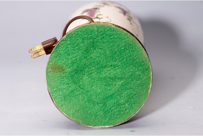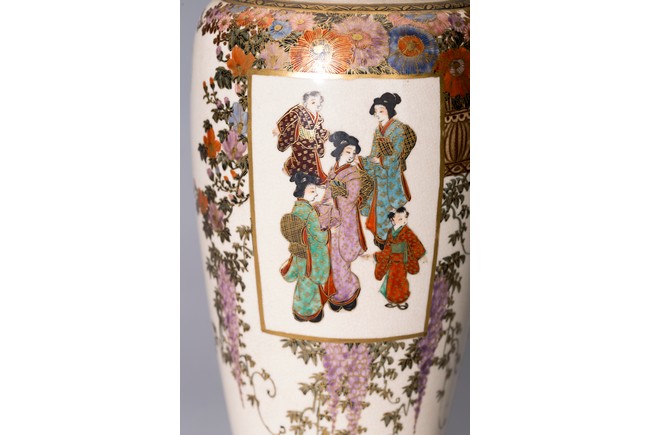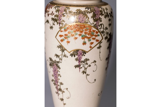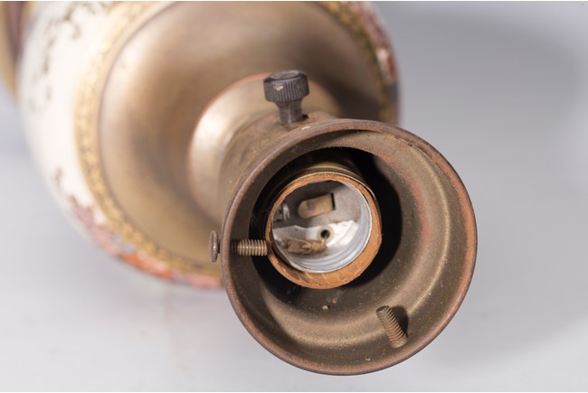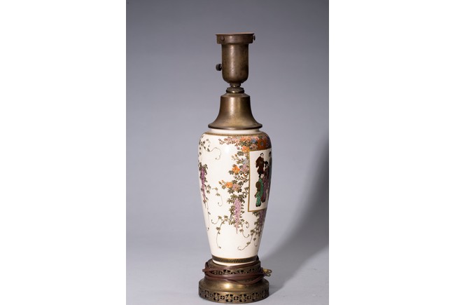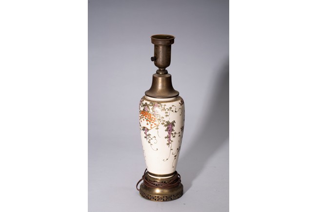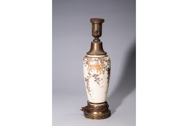 The tall vase decorated in iron-red, blue, green enamels and gilt with flowers. Mounted as lamp. Meijing period.