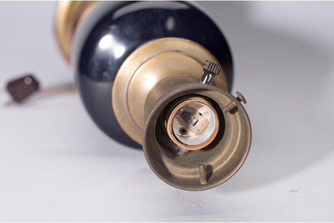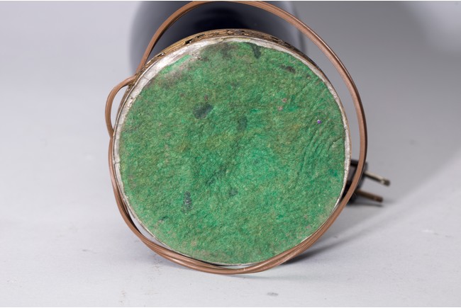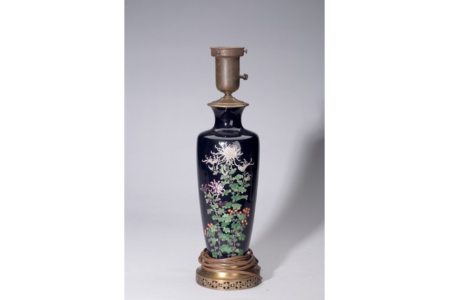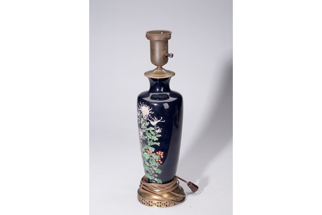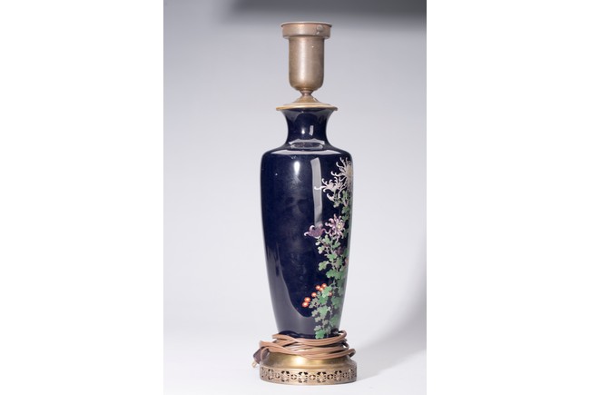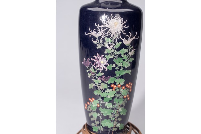 the oviform vase decorated in cloisonné enamels, depicting flowers, including chrysanthemums and irises, and foliage on a deep-blue ground, mounted as lamp. Meijing period.