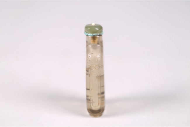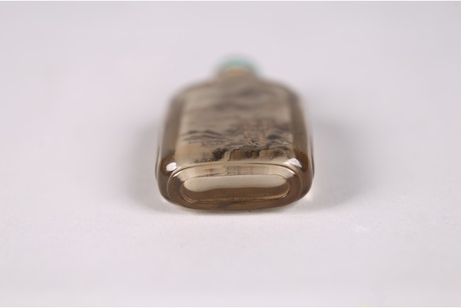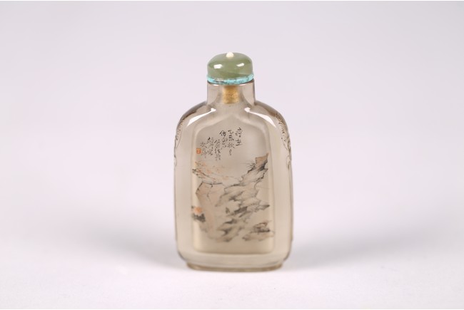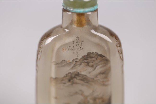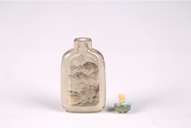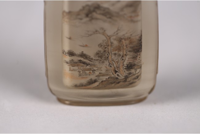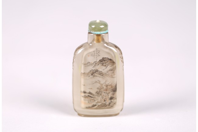 Chinese. Painted on one main side with an idyllic landscape scene with country residences beneath large trees beside a lake or river with two sailing boats beneath more distant peaks, inscribed in script 'dedicated to Qing Shan Brother' and dated to autumn of 1895, with one seal of the artist, Ding; the reverse side painted with rockworks and plum blossoms branches. With Jade stopper.