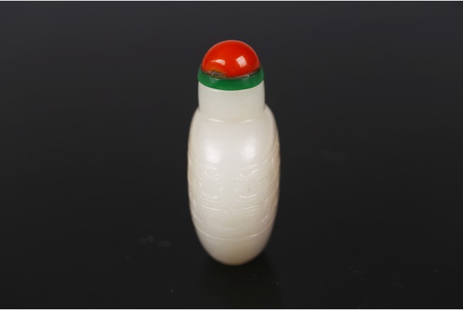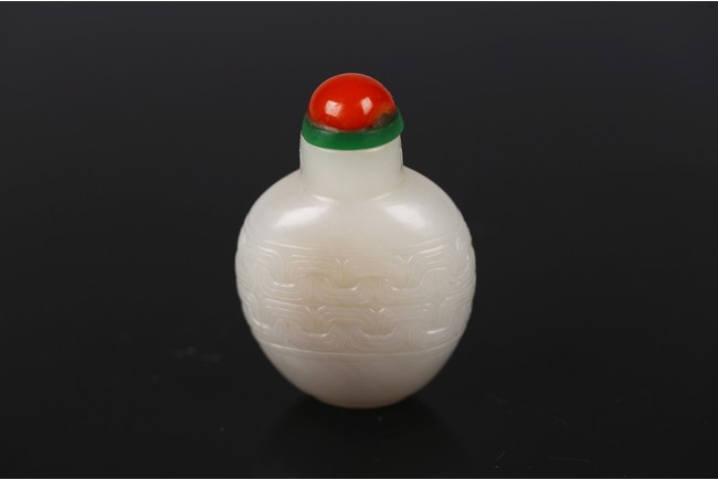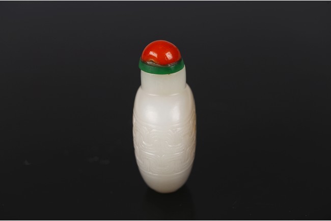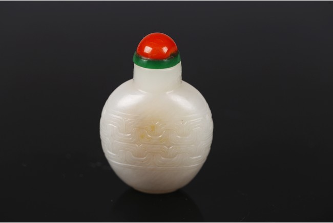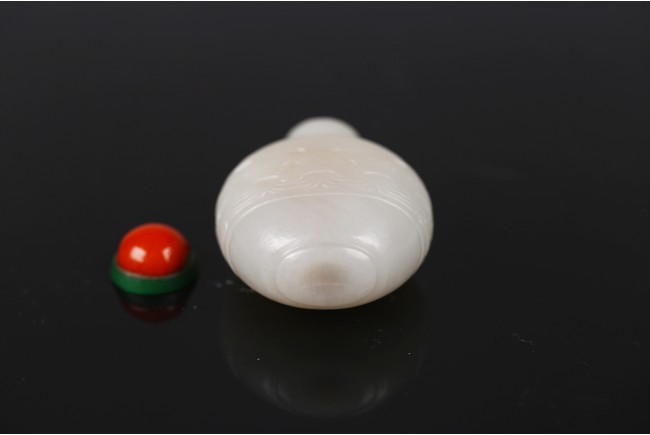 Of rounded form, carved with a band of interlocking rope to the body, the stone is of even white tone, with stopper. Qing Dynasty period.