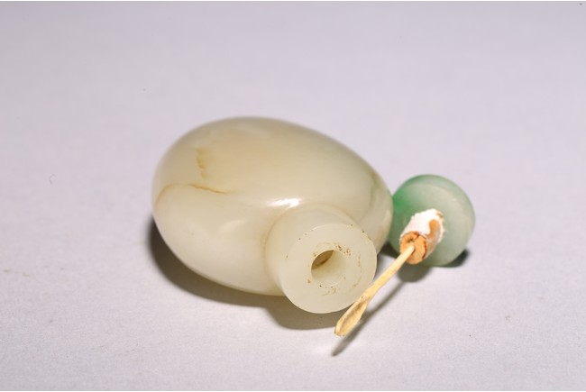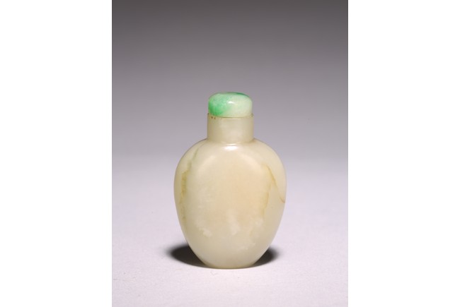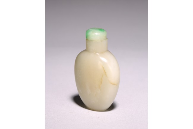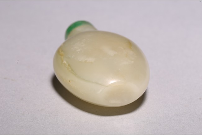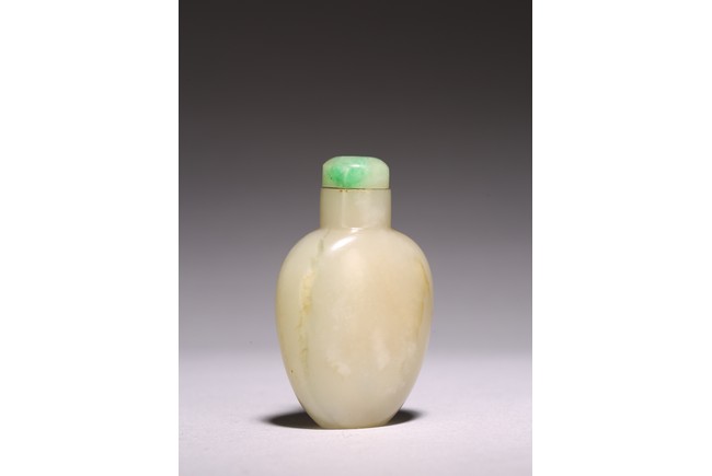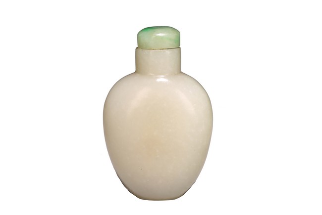 Chinese. Of oval form body and straight cylindrical neck, completed with a jadeite carved stopper. The stone is of polished white tone. Qing Dynasty period.