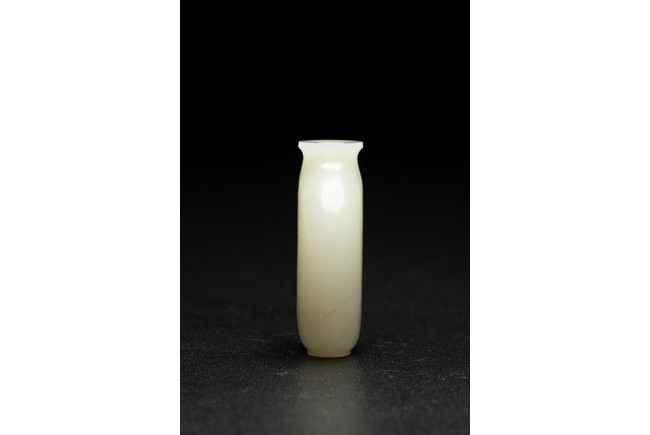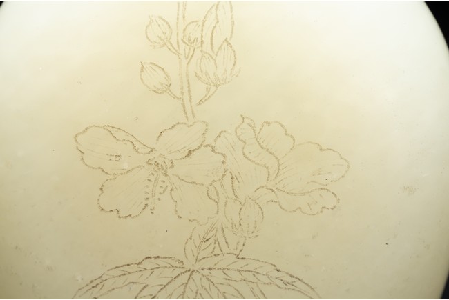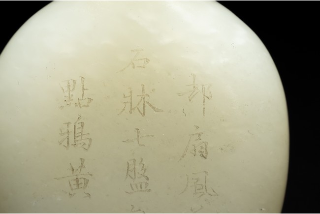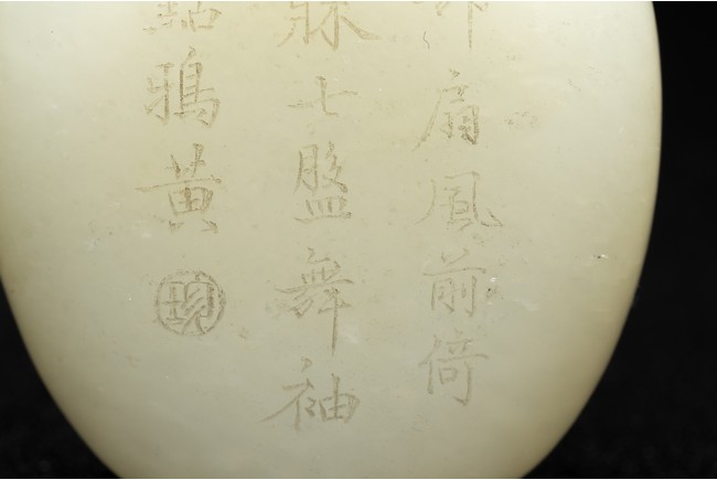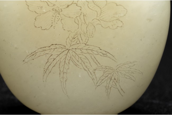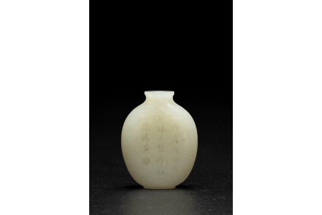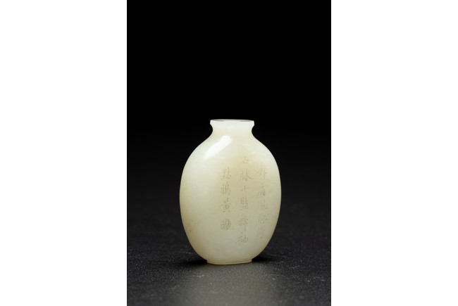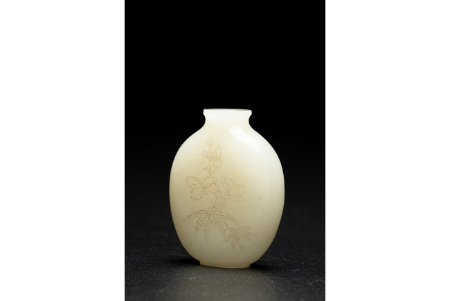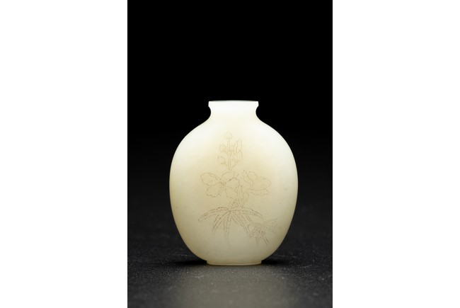 The snuff bottle inscribed with leafy flower sprig, the reverse inscribed with poem, the stone is of even white tone. Qing Dynasty period.