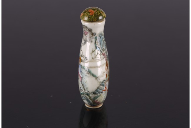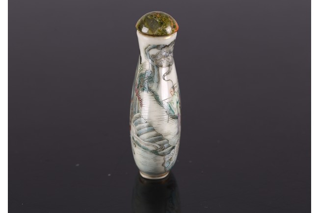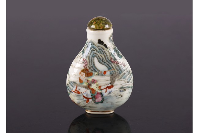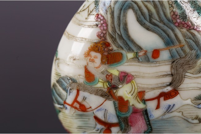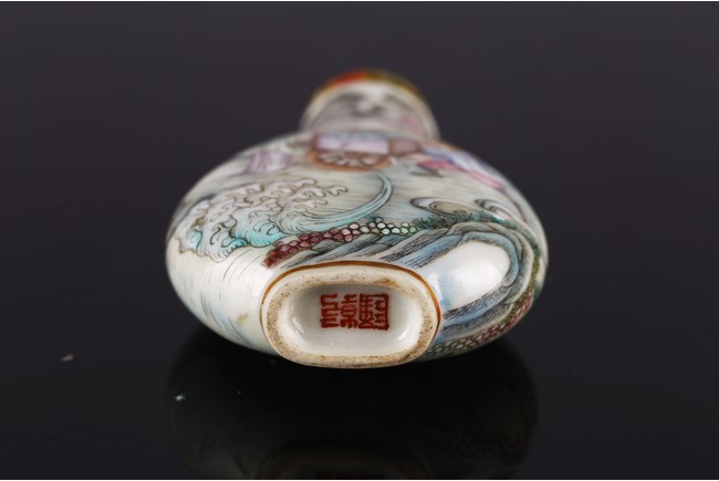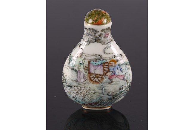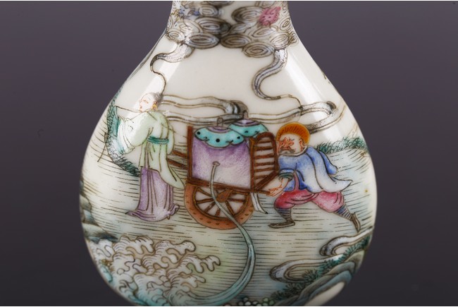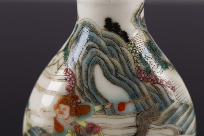 Of pear shape rising from a short foot to a waisted neck, the body elaborately enamelled in great details in famille-rose to depict a warrior on horse on one side and a foreigner figure pushing trolley behind a man, with dragon emerging from clouds above and turbulent ocean waves below, base with Qianlong mark. Qing Dynasty Qianlong period.
