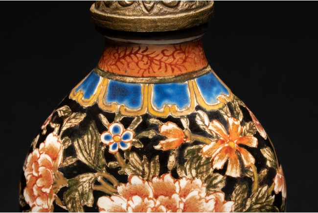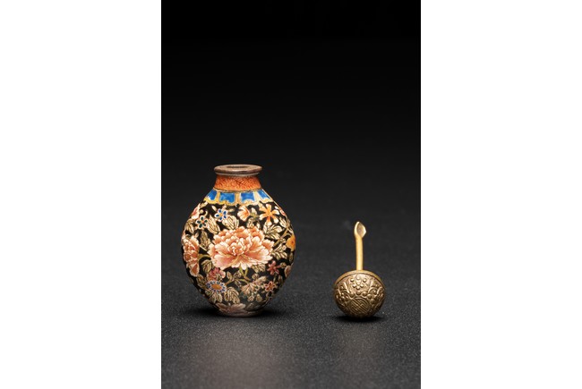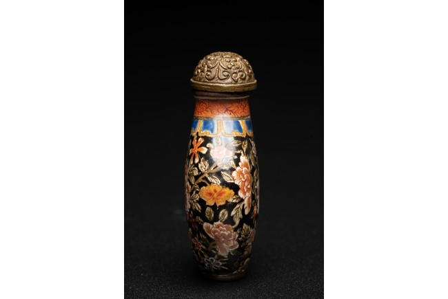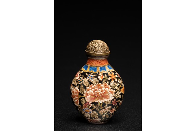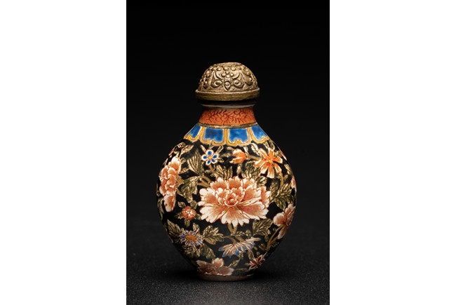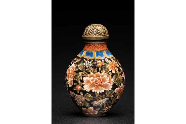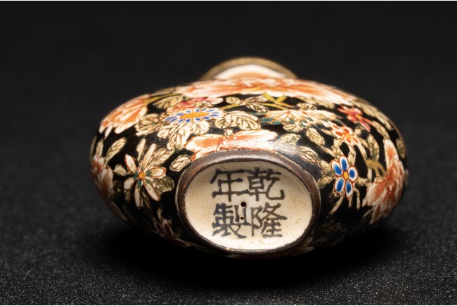 Painted in famille-rose enamels with dense pattern of various flowerheads borne on leafy branches reserved on black ground, base inscribed with Qianlong reign mark. Qing Dynasty period.
