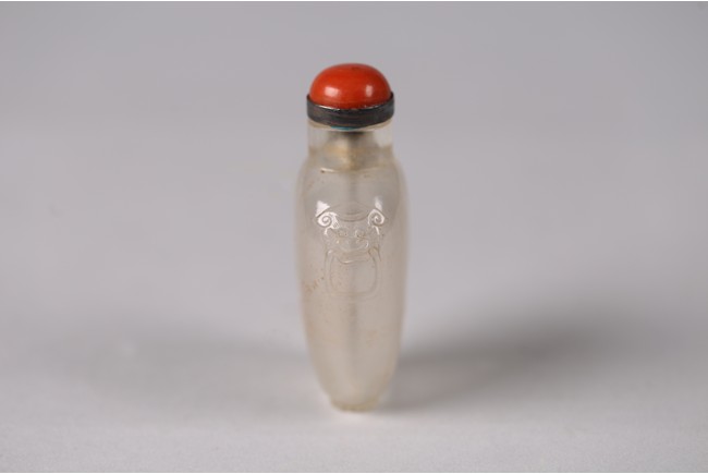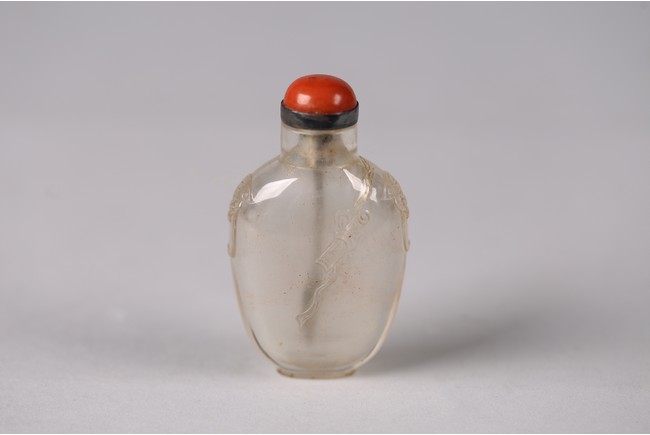 Of ovoid form, carved in low relief with scrolls tied on a ribbon, the shoulder carved with pair of mythical beast masks. Qing Dynasty period.