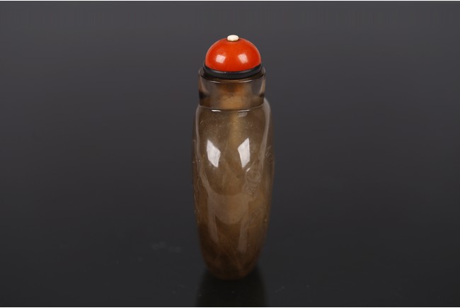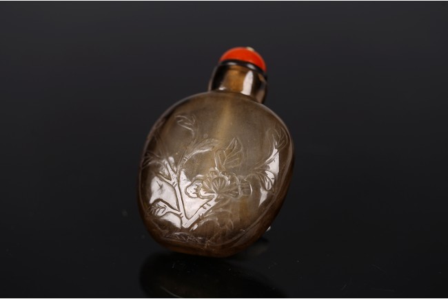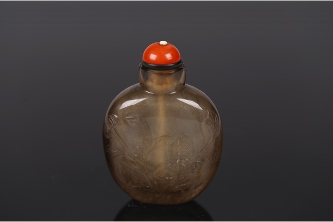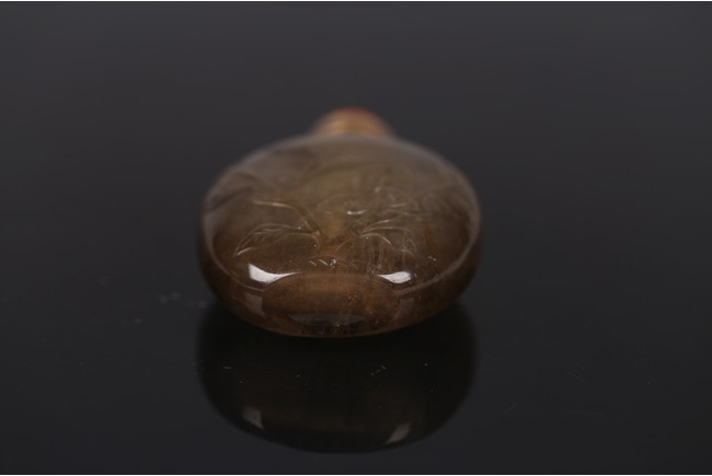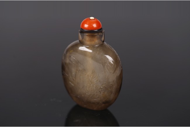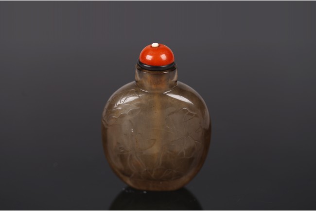 A SMOKY CRYSTAL 'LOTUS' SNUFF BOTTLE 清 水晶荷塘紋鼻煙壺