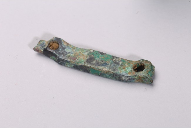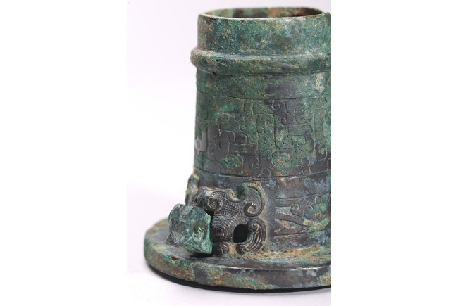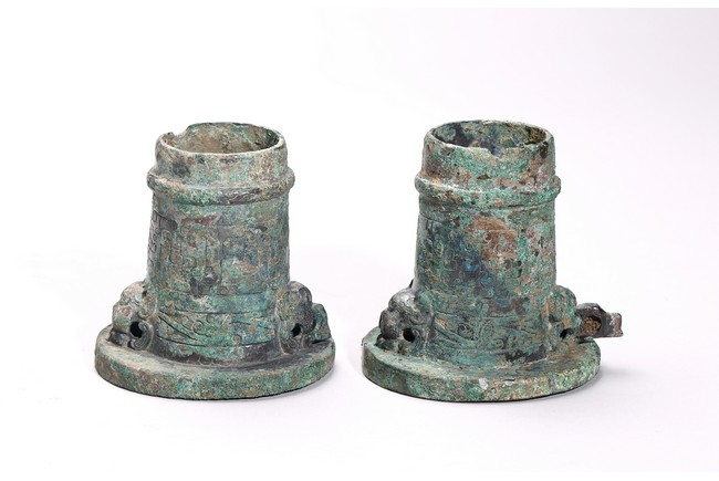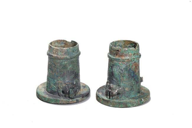 Each with a dense and refined decoration of slightly raised motifs on the outside, the end of the pins modeled like a tiger's head, with hidden linchpins. Warring State period, 5th-3rd century BC.