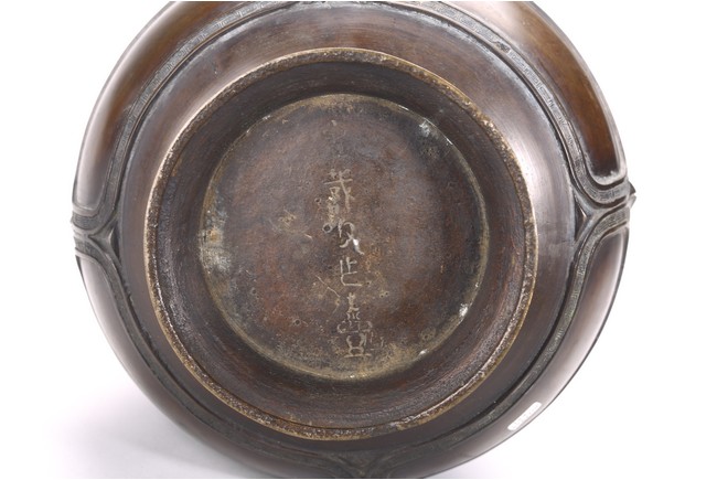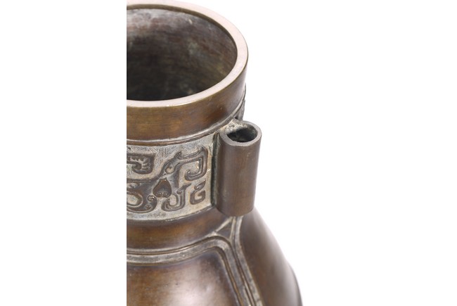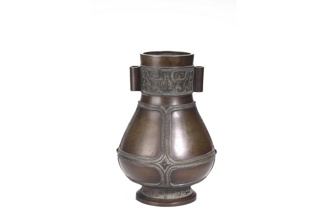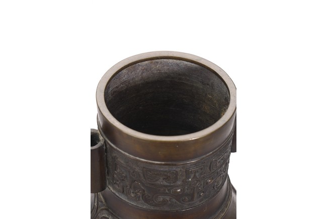 The pear-shaped body rising from a tall splayed foot to a gently waisted neck, encircled by a wide band of taotie masks reserved against a leiwen ground, flanked by a pair of similarly decorated tubular handles, the base cast with archaistic inscriptions. Ming Dynasty period.