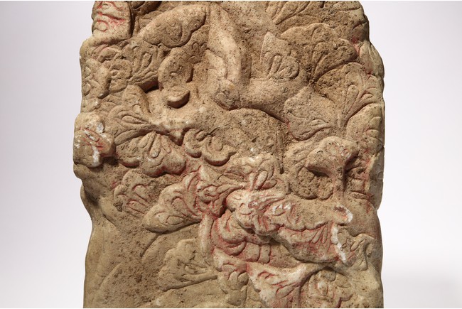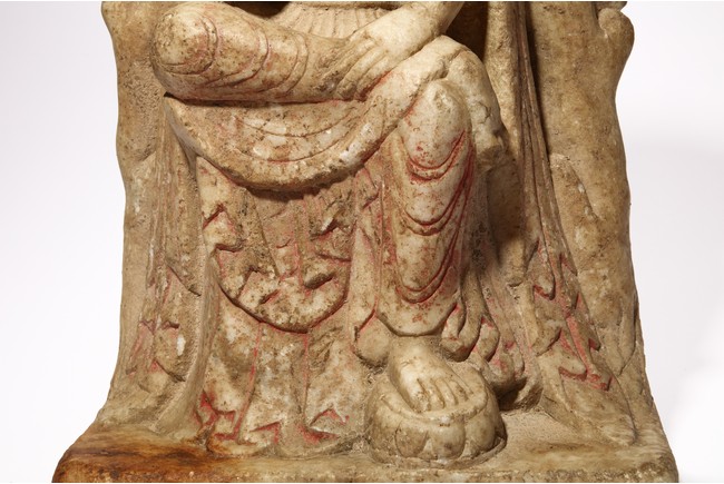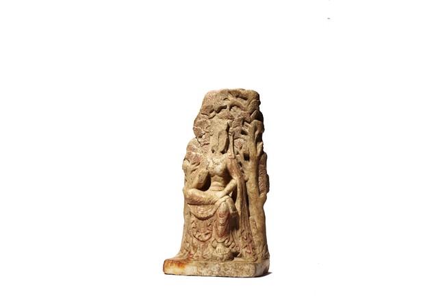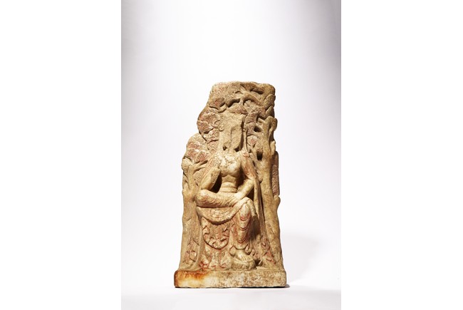 The marble stele is carved with a pensive buddha modelled in the round seated in lalitasana with leg crossed over the left knee, his left hand resting on his right foot while the right arm (now missing) bends up toward the face in pensive thought, the Figurines dressed in a long robe clinging around the body and draping in loose folds over his legs, all against a bodhi tree, overall with traces of red pigments. Northern Qi Dynasty period.