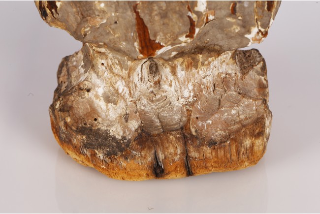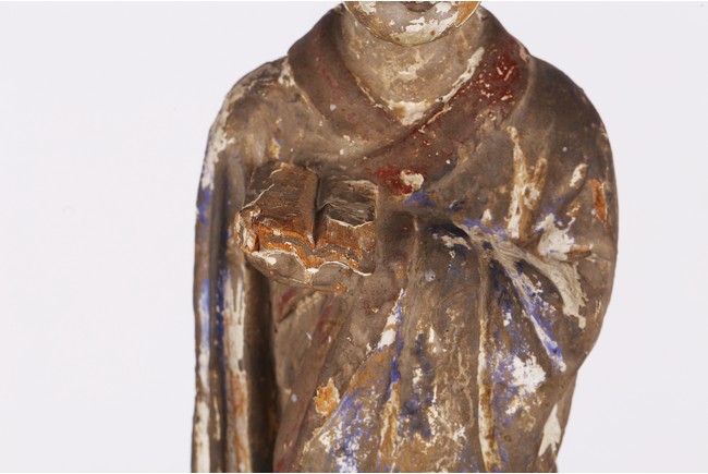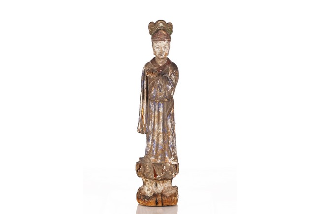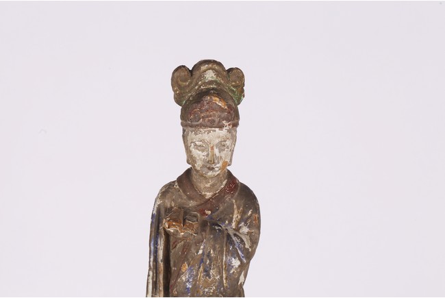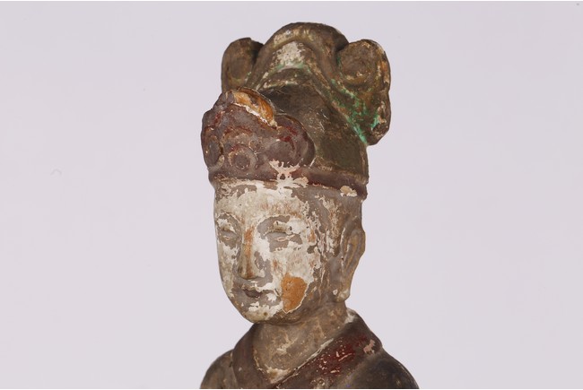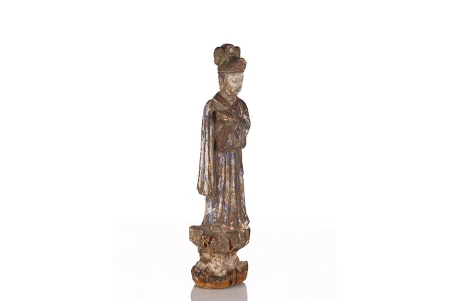 Carved standing, the left hand holding a book in front of the chest, dressed in long robes, wearing hat, the face with an calm expression Yuan Dynasty period..