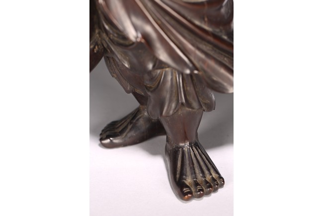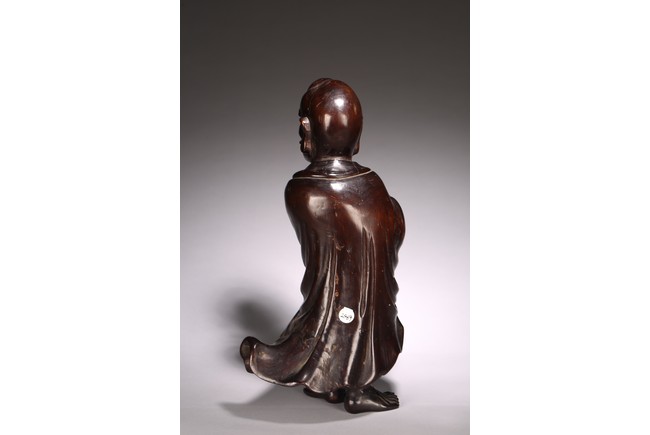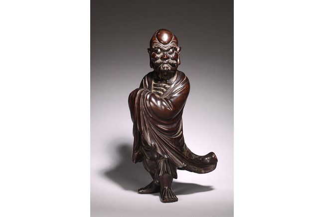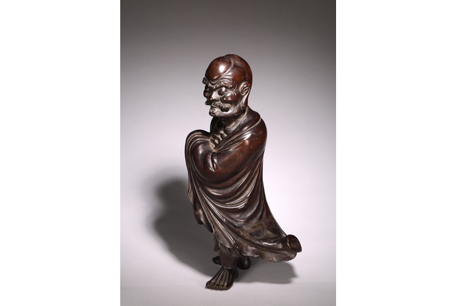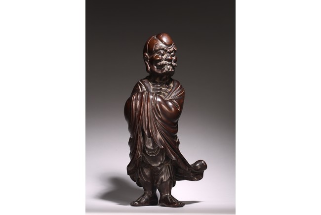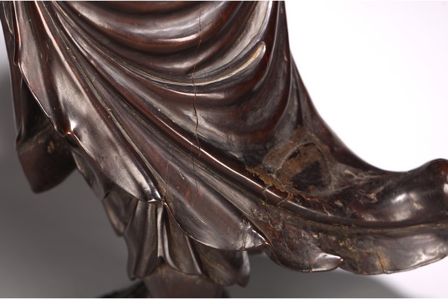 Chinese. The deity standing barefoot, his hands held within the long sleeves of his flowing garment opening at his chest, the face framed by facial hair arranged in curls. Qing Dynasty period.