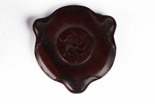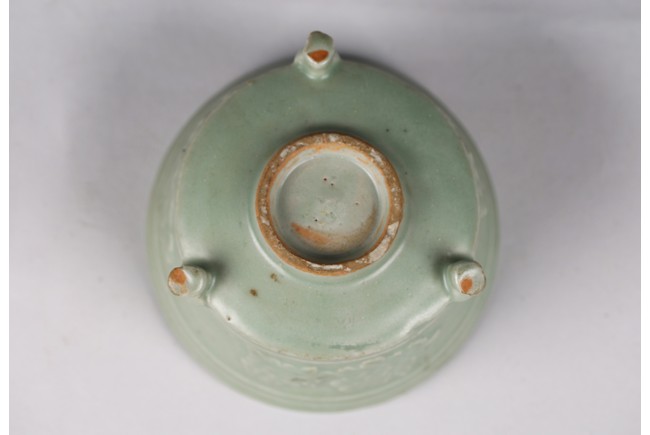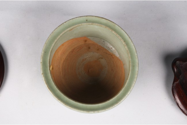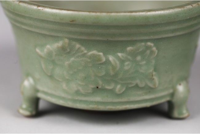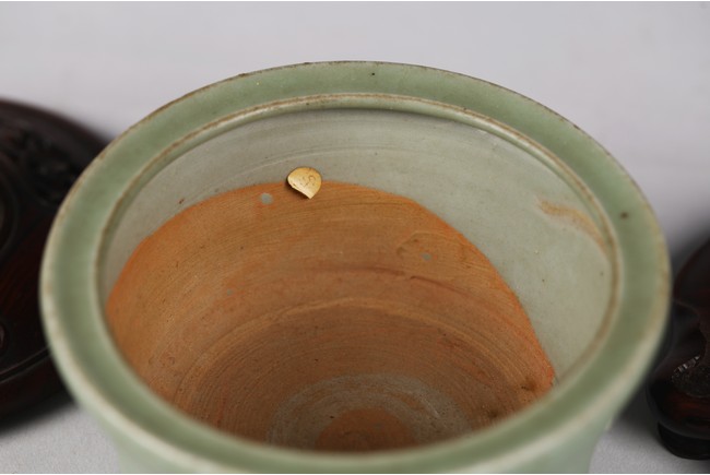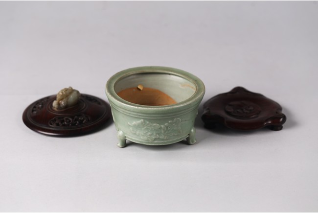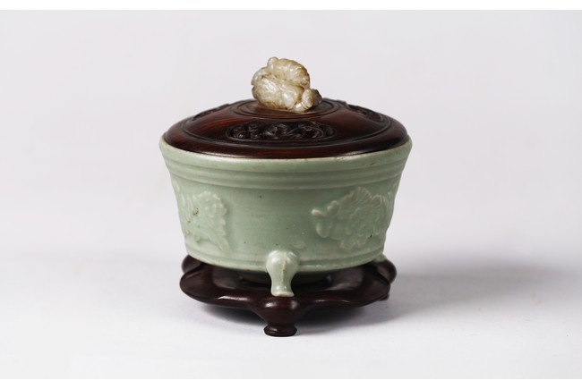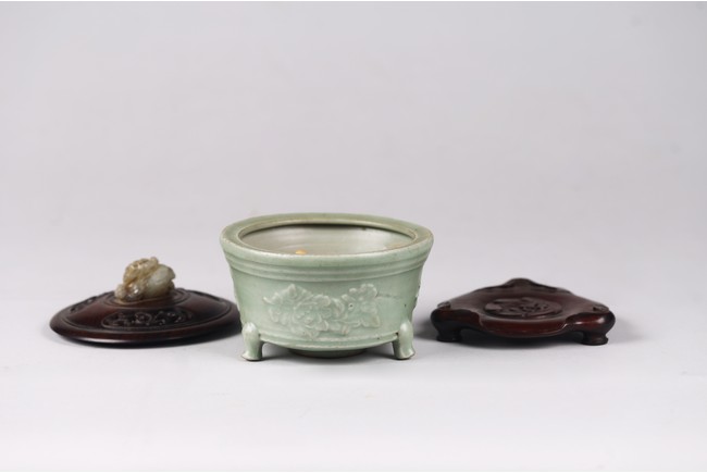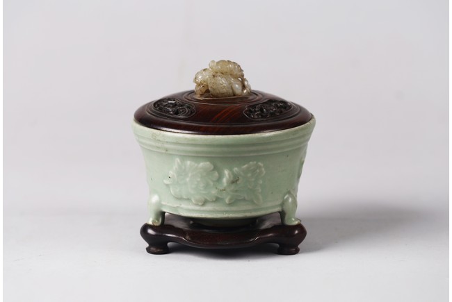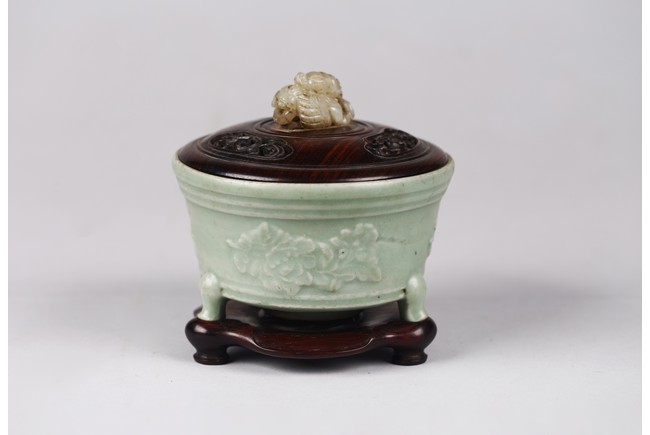 Chinese. The sides relief-molded with peony sprays between the cabriole legs joined by narrow groove, and with a double-grooved band below the inwardly canted rim, covered with a glaze of sea-green tone, an unglazed area in the interior fired to an orangey-brown color, accompanied with zitan cover and stand. The cover mounted with a jade carved figure. Southern Song Dynasty period.