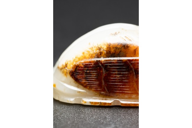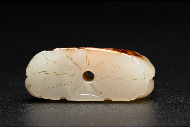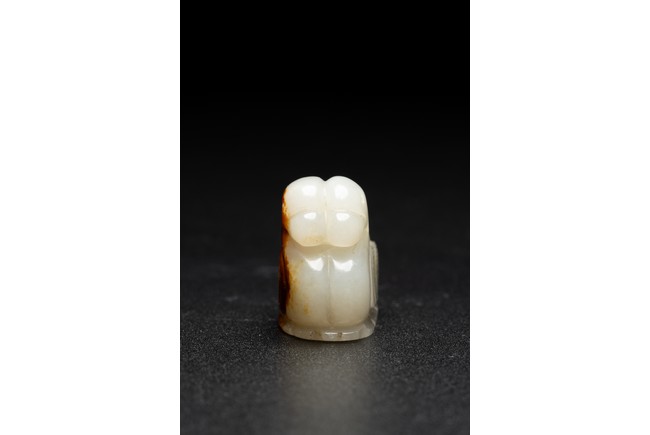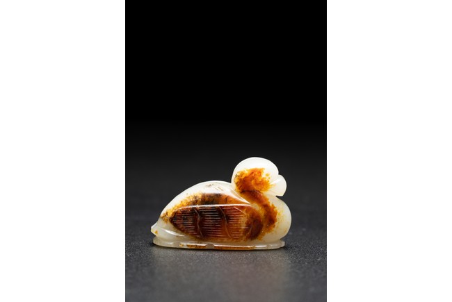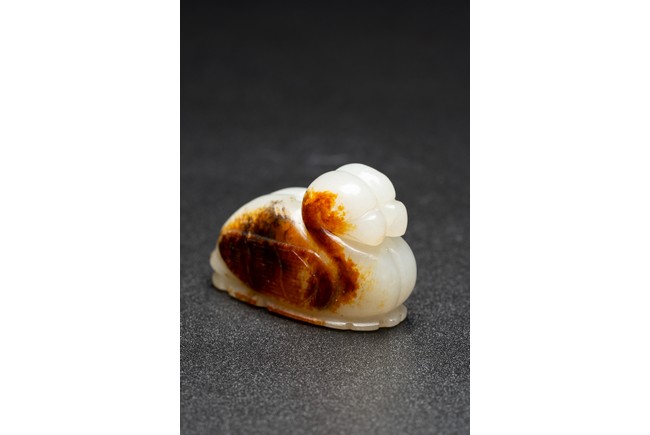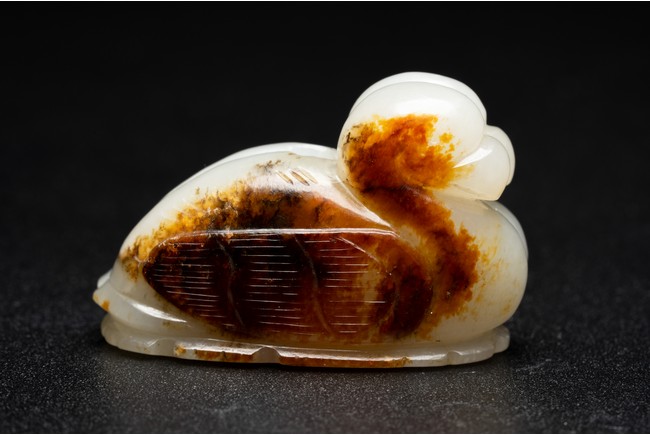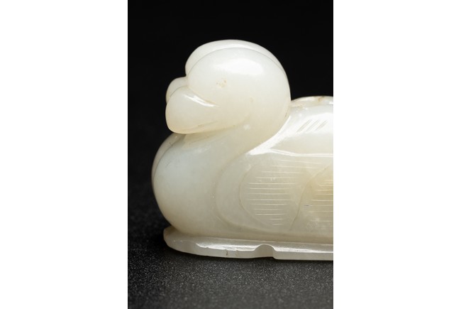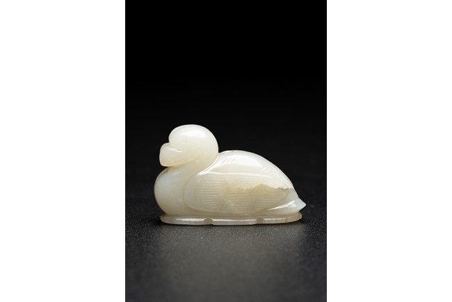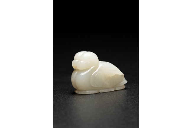 Carved in the form of two ducks swimming side by side, the stone is of even white tone with dark russet skin to one wing. Qing Dynasty period.