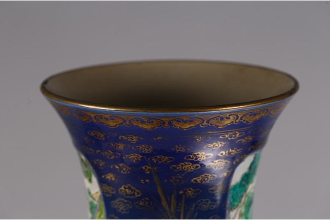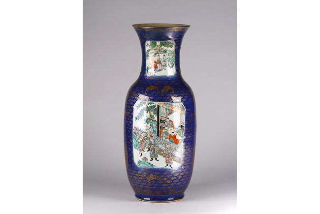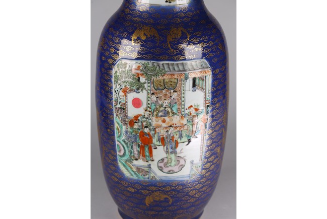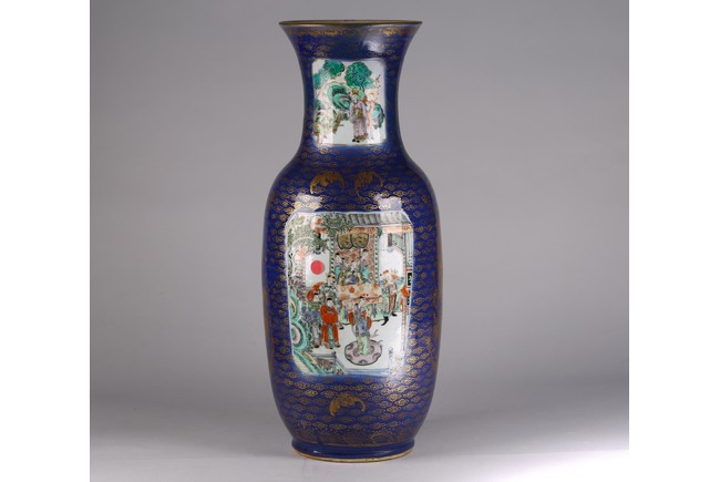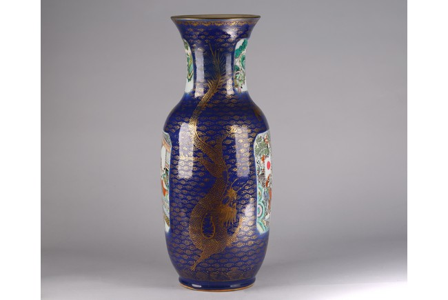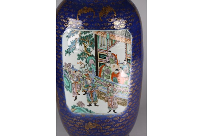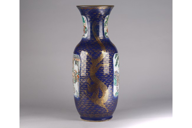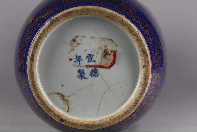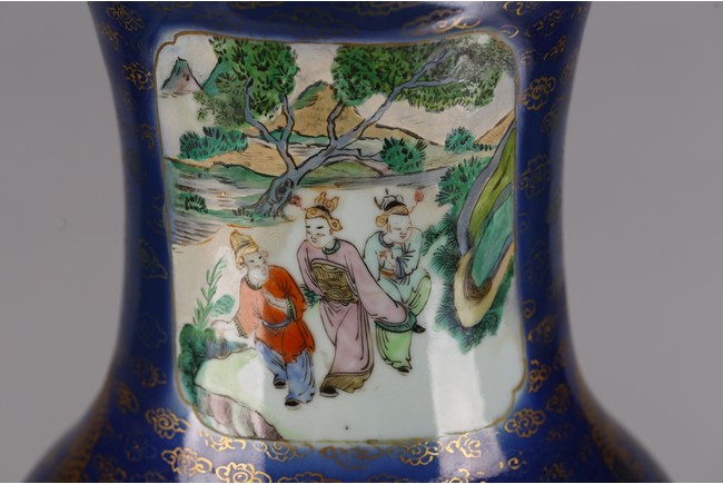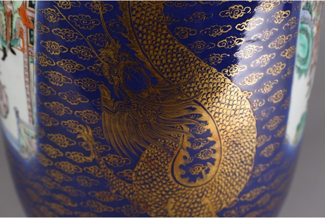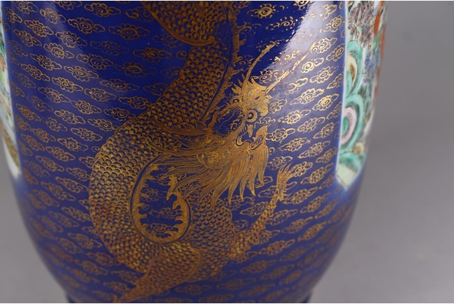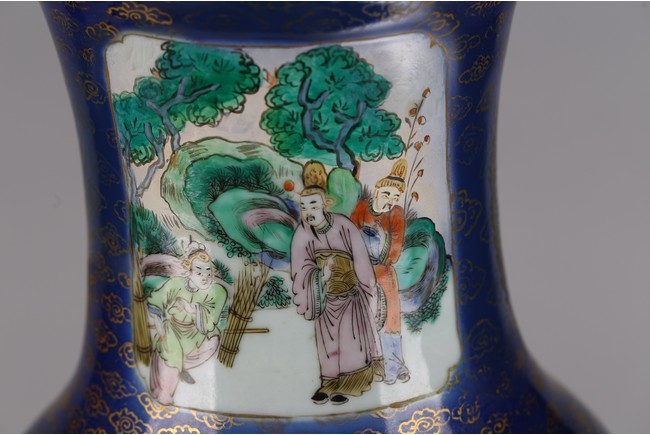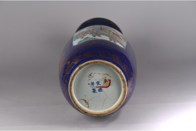 Chinese.The body and neck painted with cartouches enclosing figures and story scenes, all reserved on blue glazed ground painted with with dragons and flying bats amidst dense cloud motifs. The base inscribed with apocryphal four character Xuande mark. Qing Dynasty period.
