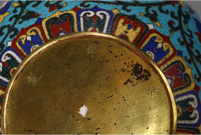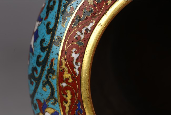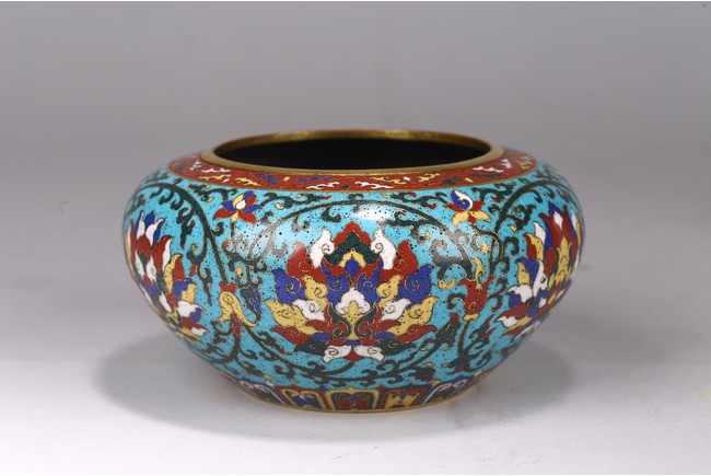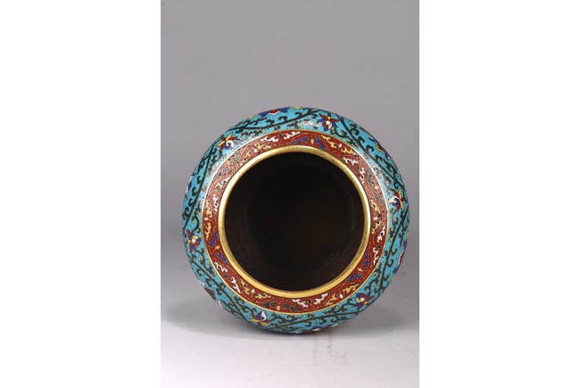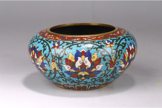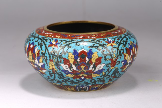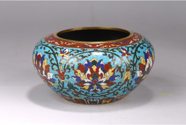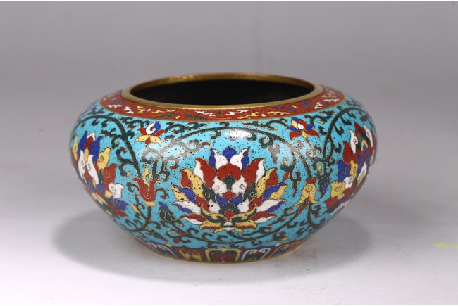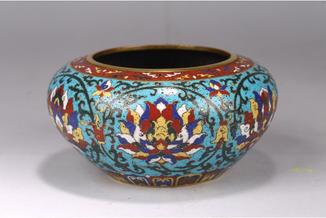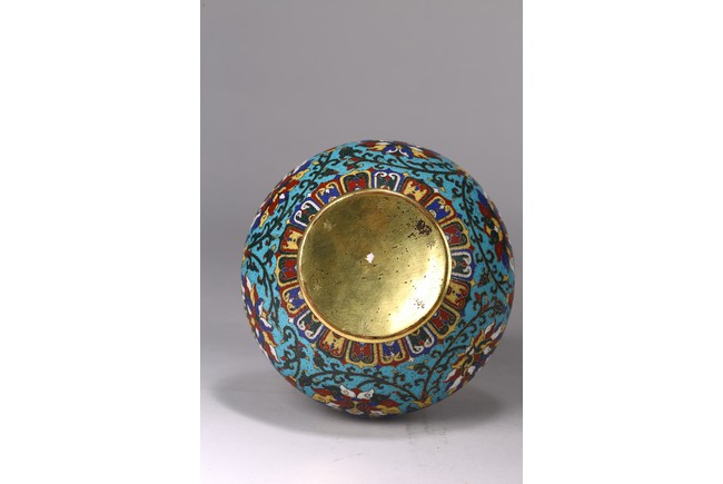 The compressed globular body finely cast with rounded bulging shoulders below a curved lipped mouth rim, the exterior vibrantly enamelled in red, yellow, blue, green and white with scrolling lotus decorations, all on a rich turquoise blue ground, the richly gilt base inscribed with apocryphal Jing Tai reign mark. Qing Dynasty period.