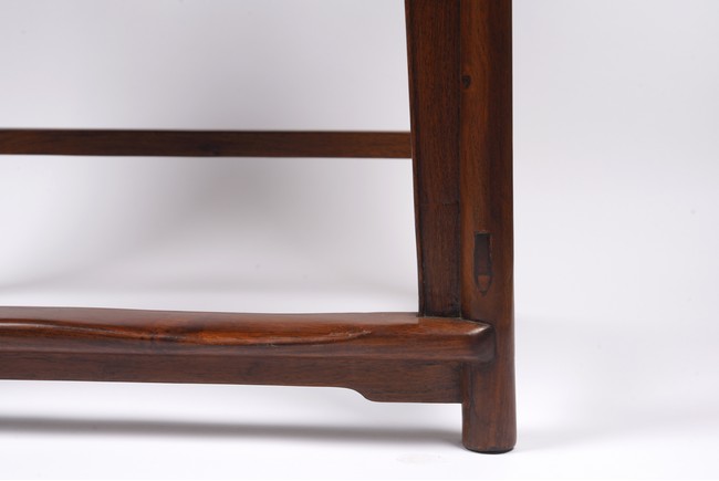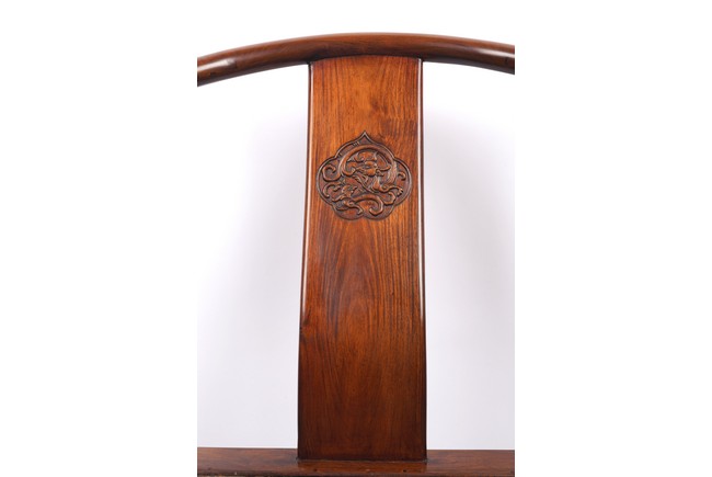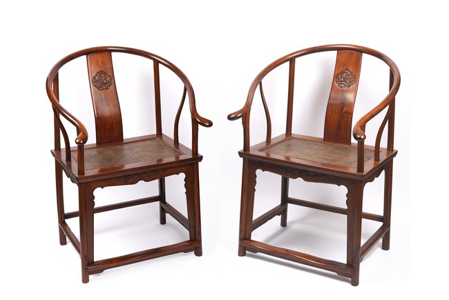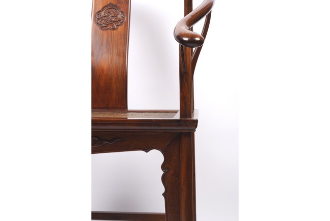 Each with a curving top rail sloping down to the arms supported on serpentine side posts and terminating in a curved hook beyond the corner posts set with shaped spandrels, the backsplat carved with a ruyi-shaped panel enclosing mythical beasts, the back corner posts continuing below the rectangular frame, with mat seat, to the back legs joined by stretchers, the front legs with a cusped arching apron. Qing Dynasty or Republic period.