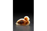 A WHITE JADE RECUMBENT TWIN DUCK WITH SKIN