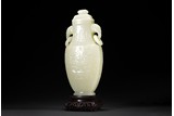 A WHITE JADE 'TAOTIE' ELEPHANT HANDLE VASE AND COVER