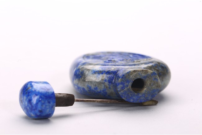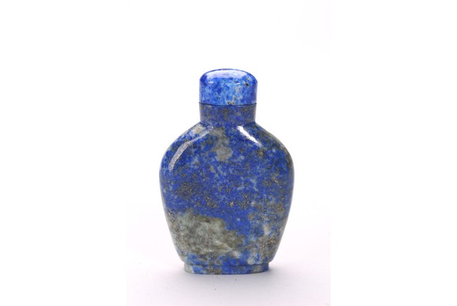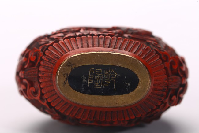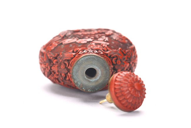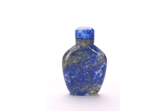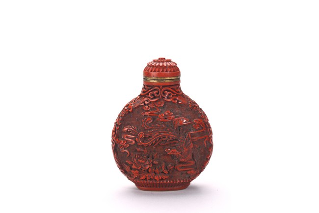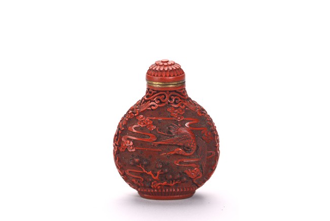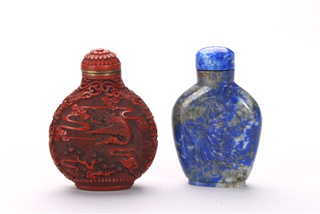 Comprising of a cinnabar lacquer 'crane' snuff bottle with stopper; and a lapis lazuli snuff bottle carved in relief with a female immortal figure. Qing Dynasty period.