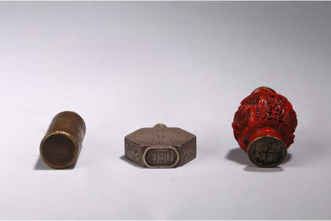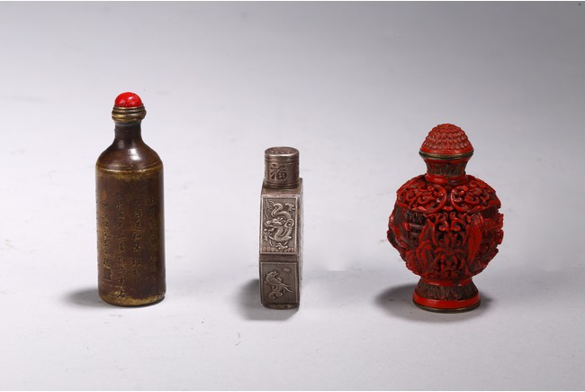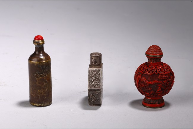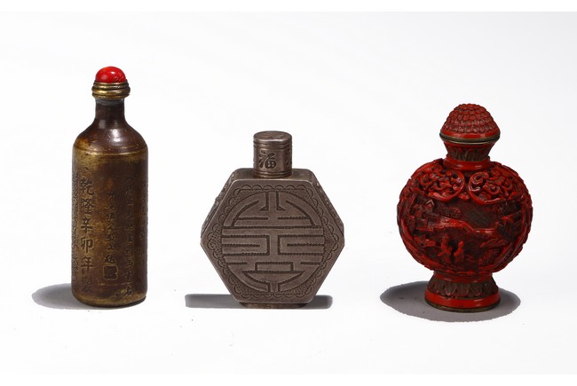 Chinese. Comprising of a cylindrical brone inscribed snuff bottle, a metal hexagonal snuff bottle, and a cinnabar lacquer snuff bottle. Qing Dynasty period.