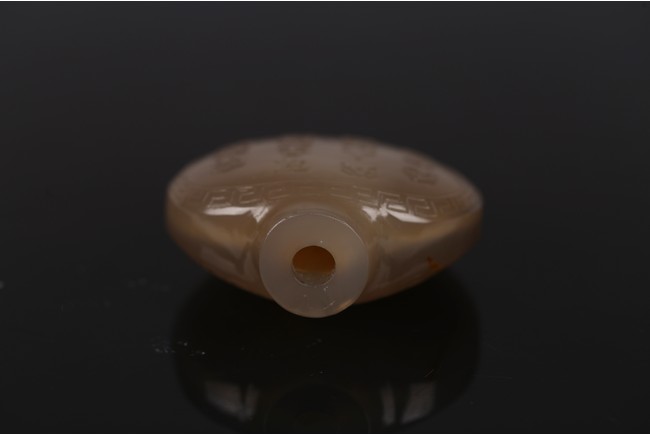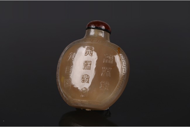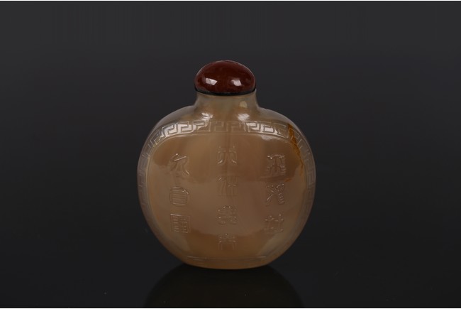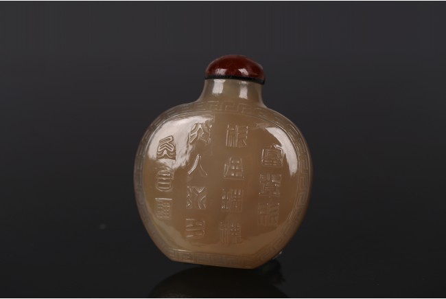The flattened snuff bottle carved in shallow relief with imperial poem and seal marks on both front and back. Qing Dynasty period.