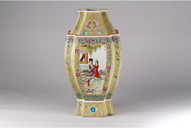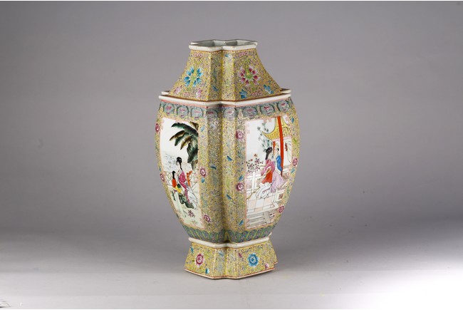 Of four lobed section, the vase decorated with on each side with cartouche enclosing male and female Figurines, the base inscribed with apocryphal Yongzheng mark. Republic period.
