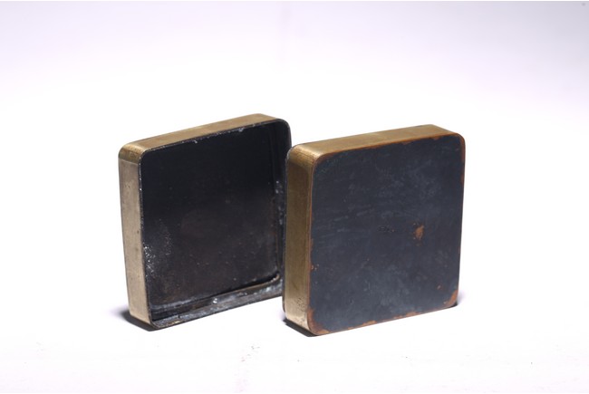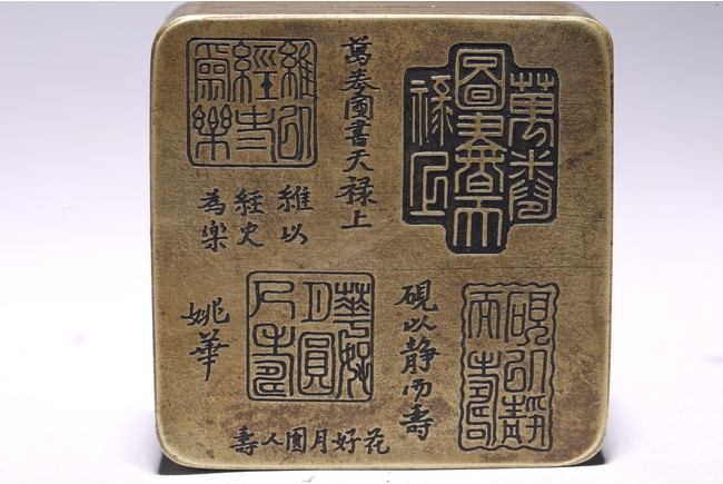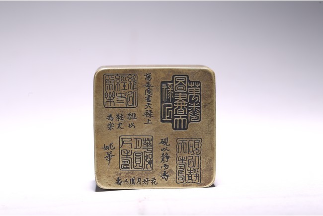 Of square form, the box cover inscribed and decorated with four seal marks and inscriptions.