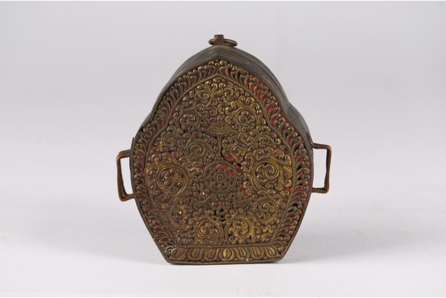 The Tibetan gau box is employed by Tibetan Buddhists to contain religious relics, historically used to protect pilgrims during their travels and to serve as a portable shrine. The central window allows the precious objects inside to be viewed while protected. 18/19th century.
