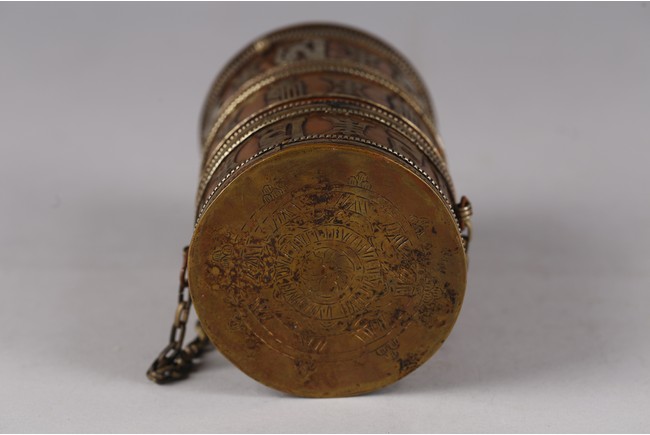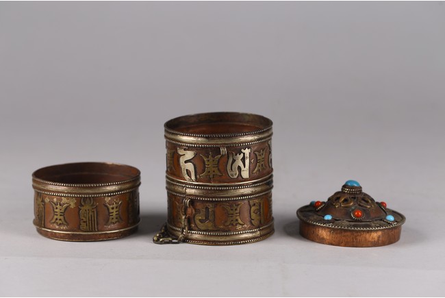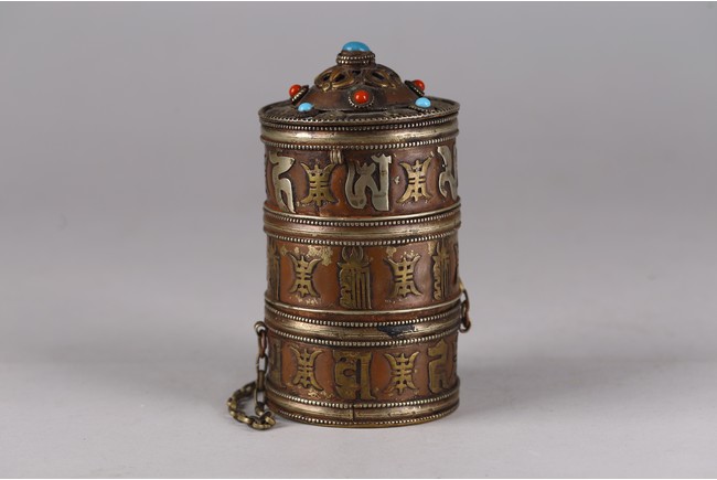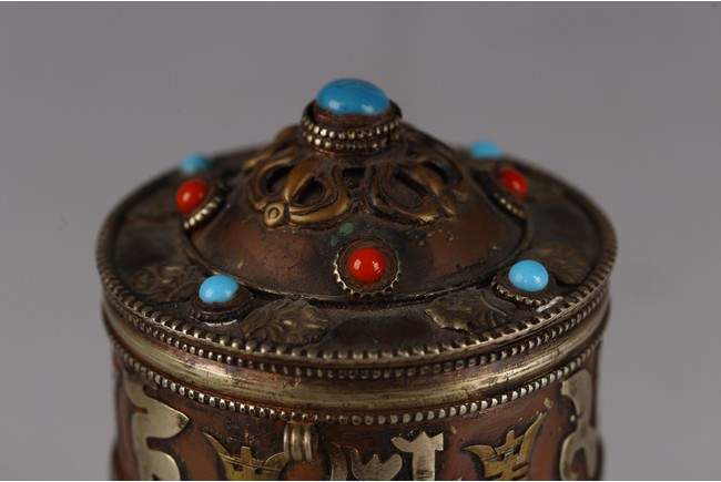 The cylindrical box modelled in form of prayer wheel with Tibetan and Chinese characters, the box cover inlaid with turquoise and coral like beads.