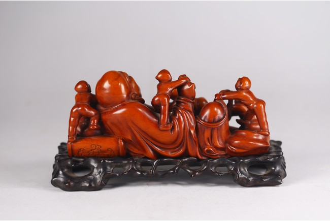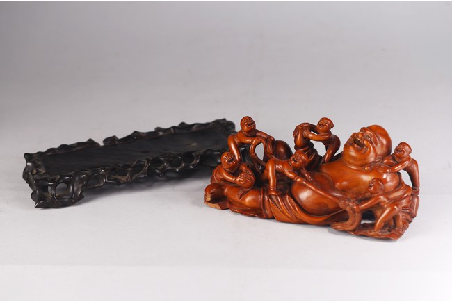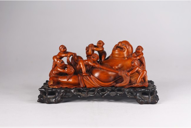 Carved in the form of reclining buddha with joyful expression with seven young boys playing around him, all supported on hardwood stand. Qing Dynasty period/Republic period