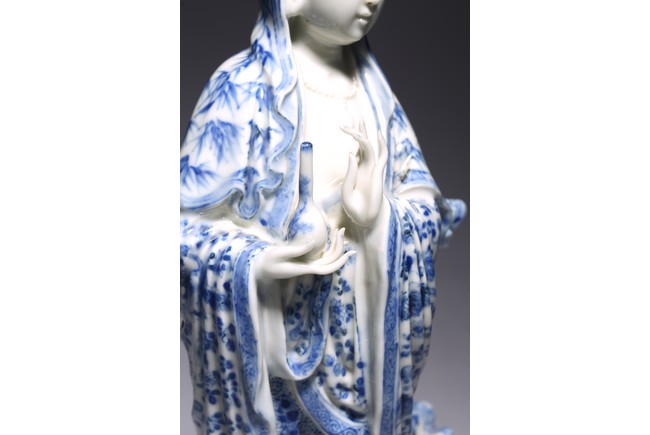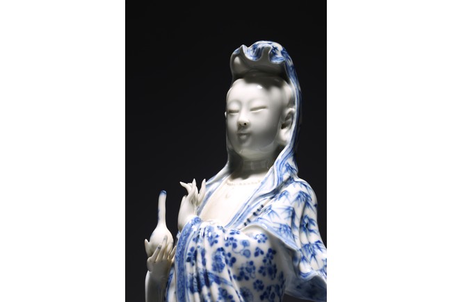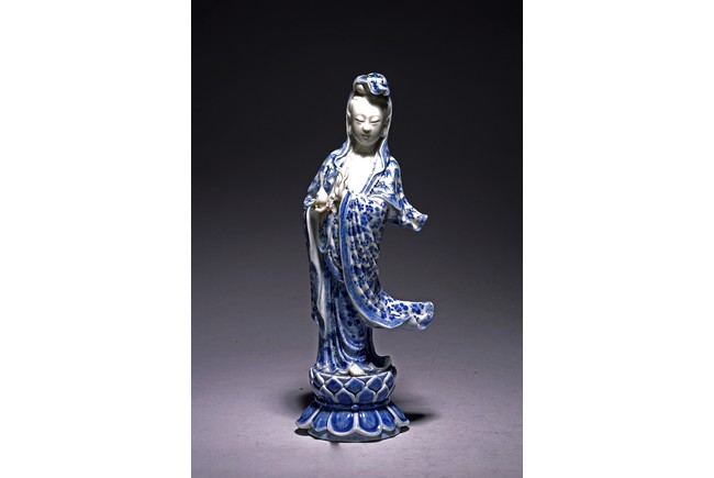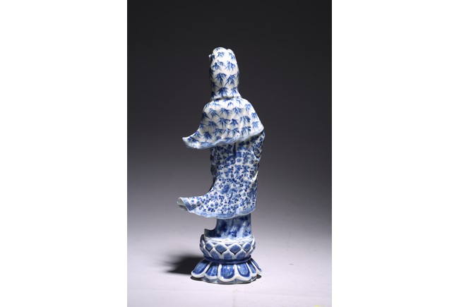 Modelled standing upon a lotus base, a cowl over her high chignon, left hand holding a vase, the long robes decorated with bamboo and densely scattered flowerheads, impressed four character 'Chen Sheng Shen Zhi' hall mark to reverse of base. Republic period.