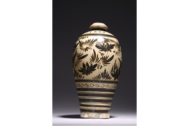 The slender tapering baluster body rising from a slightly recessed base to broad shoulders ending in a narrow neck with tapering conical mouth, covered overall in an creamy white slip, body boldly painted peony leaves and flowers.