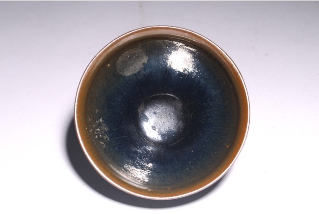 The interior and exterior of the bowl are covered with black glaze streaked with light brown 'hare’s fur’ markings, thinning to a russet-brown tone at the rim and pooling irregularly above the foot. The base inscribed with two characters. Qing Dynasty period.