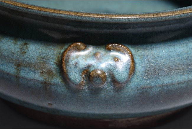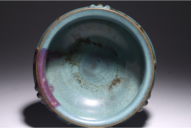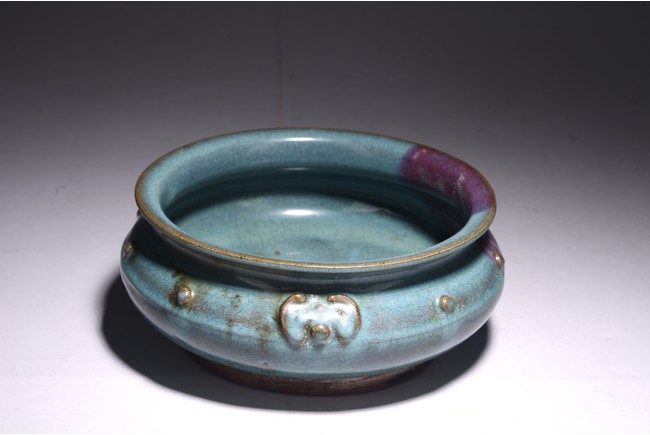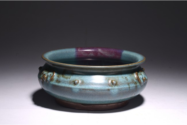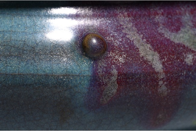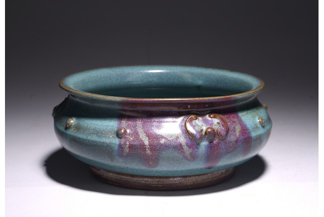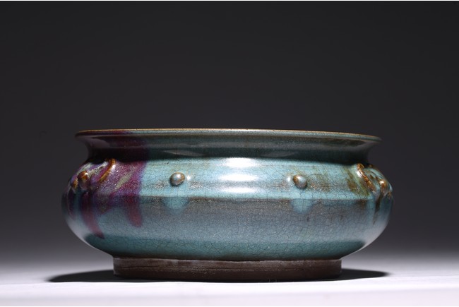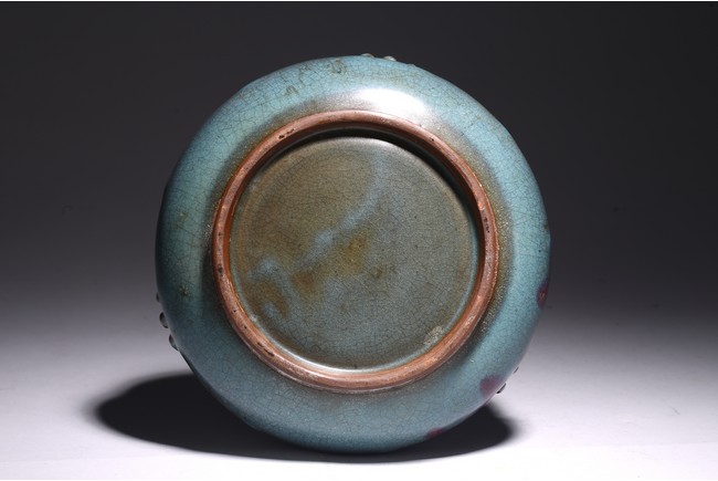 The compressed body moulded with raised bosses and bats, overall suffused with blue glaze accentuated with purple splashes.